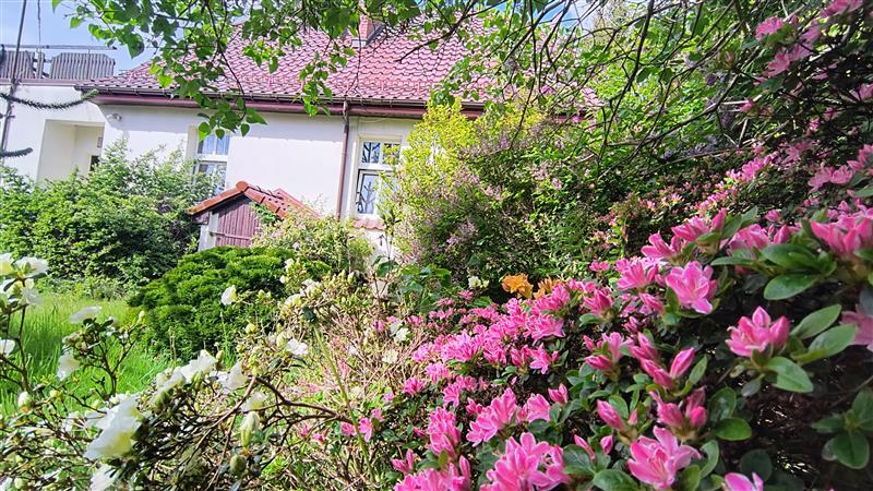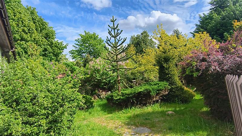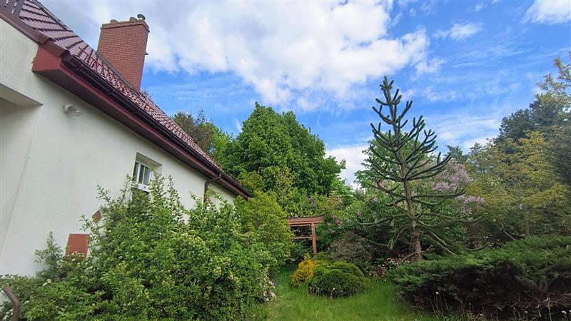 Działka o powierzchni 680m2, w kształcie zbliżonym do prostokąta, w całości ogrodzona, trawnik i nieliczne nasadzenia w tym: piękne, wieloletnie magnolie, azalie japońskie, różaneczniki, lilaki, kalina, egzotyczna kilkumetrowa arukaria oraz krzewy, uzbrojona jest we wszystkie media, budynek wyposażony w instalację elektryczną, wodną, kanalizacyjną i gazową.