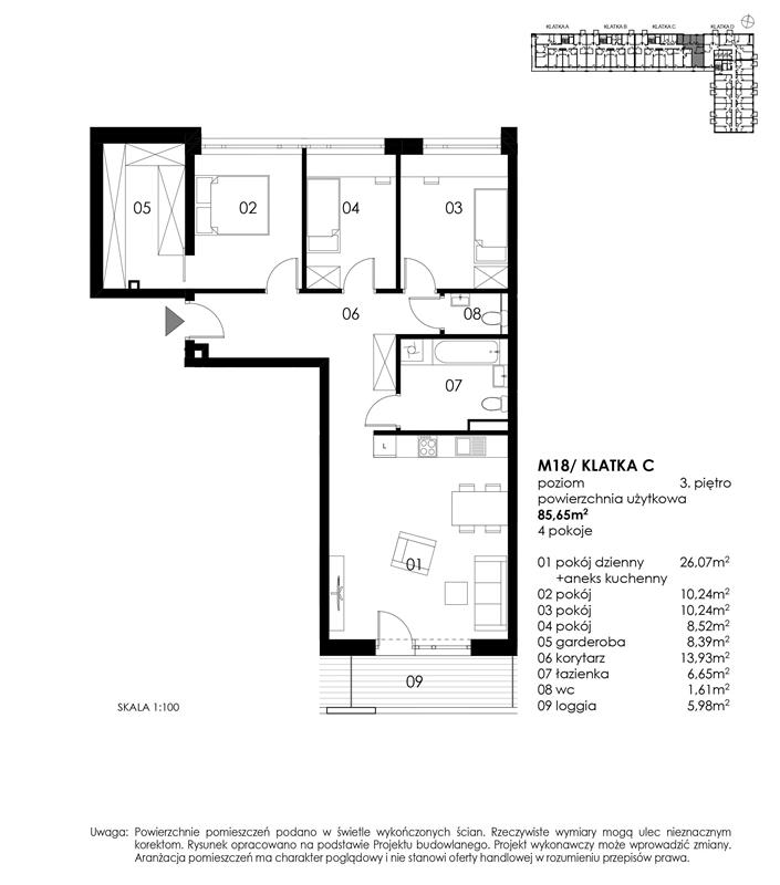 Przedstawiamy czteropokojowy lokal mieszkalny oznaczony symbolem C M18 o pow. 85,65m2, położony na III piętrze.
