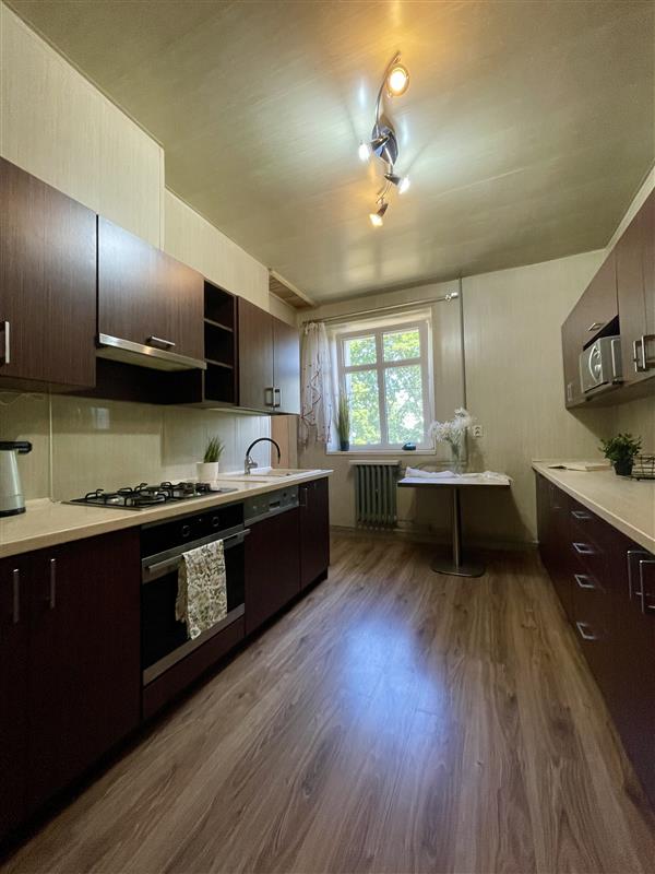 Nieruchomość składa się z czterech niezależnych pokoi (29m2, 25m2, 19m2 i 14m2), w pełni umeblowanej i wyposażonej 9m2 kuchni (na wyposażeniu m.in. kuchenka gazowa, piekarnik, zmywarka), łazienki z kabiną prysznicową, odrębnego wc, pomieszczenia gospodarczego z piecem (węgiel lub drewno) oraz przedpokoju z szafami w zabudowie.