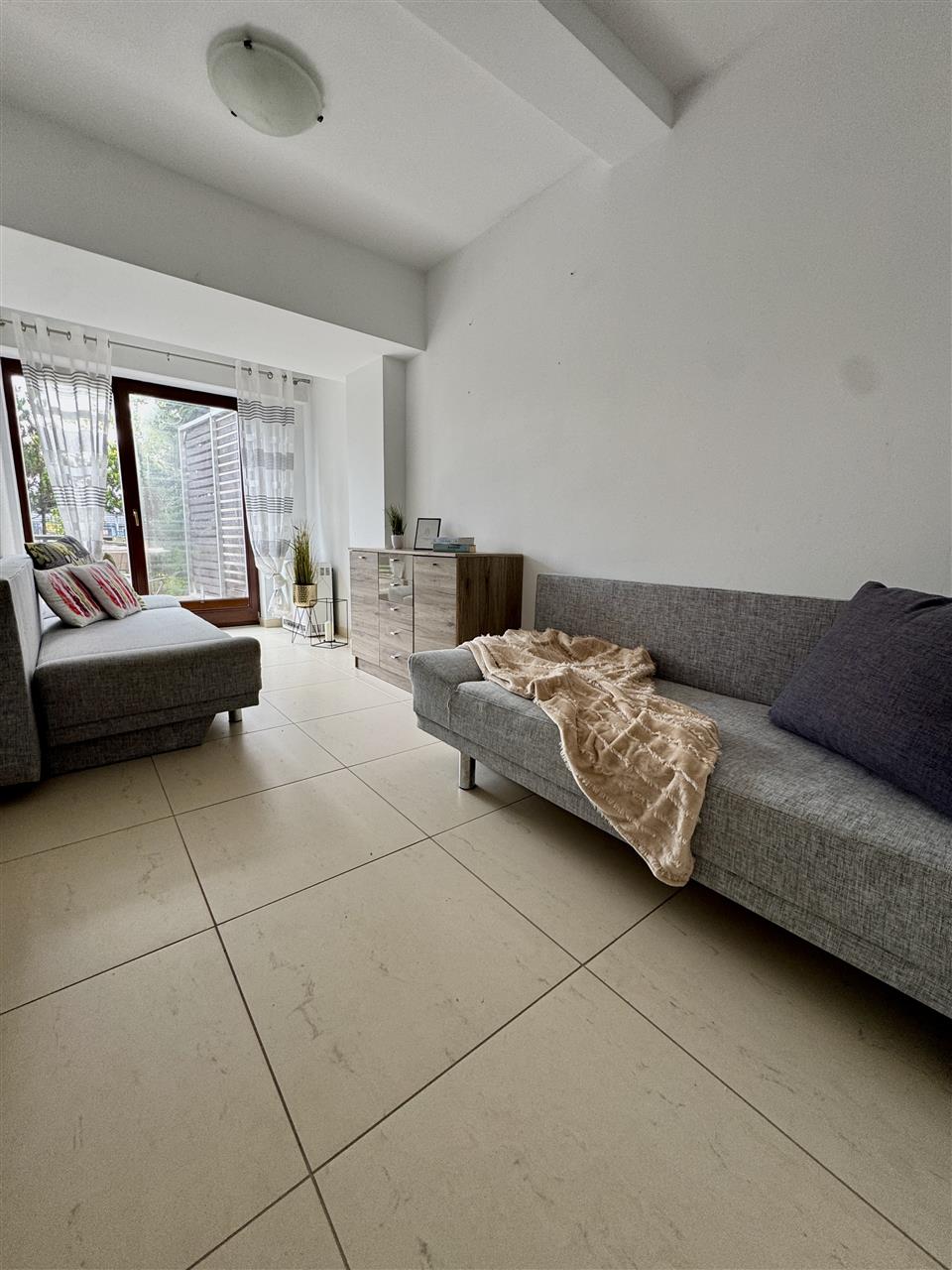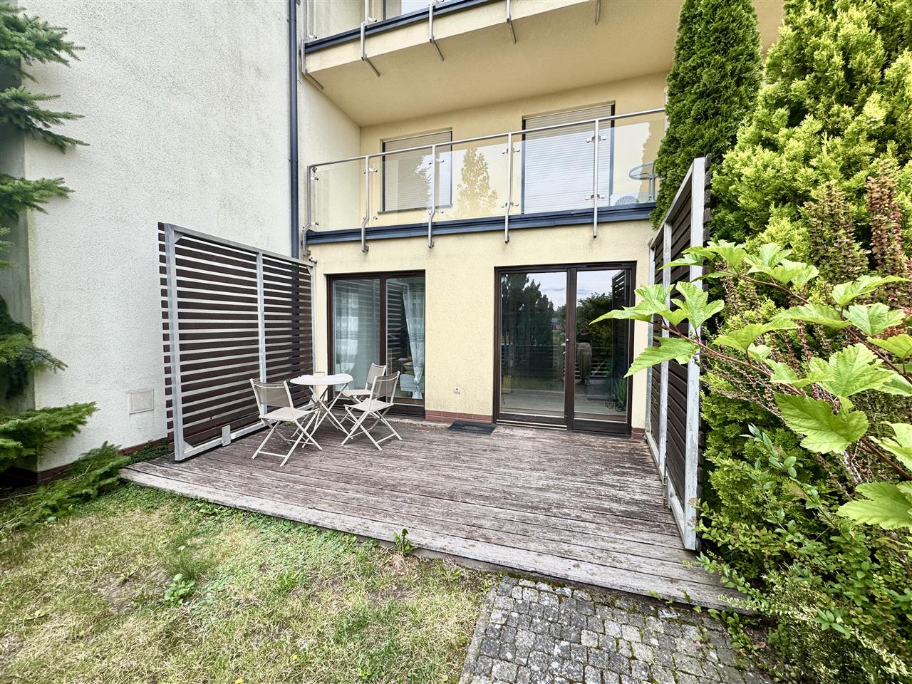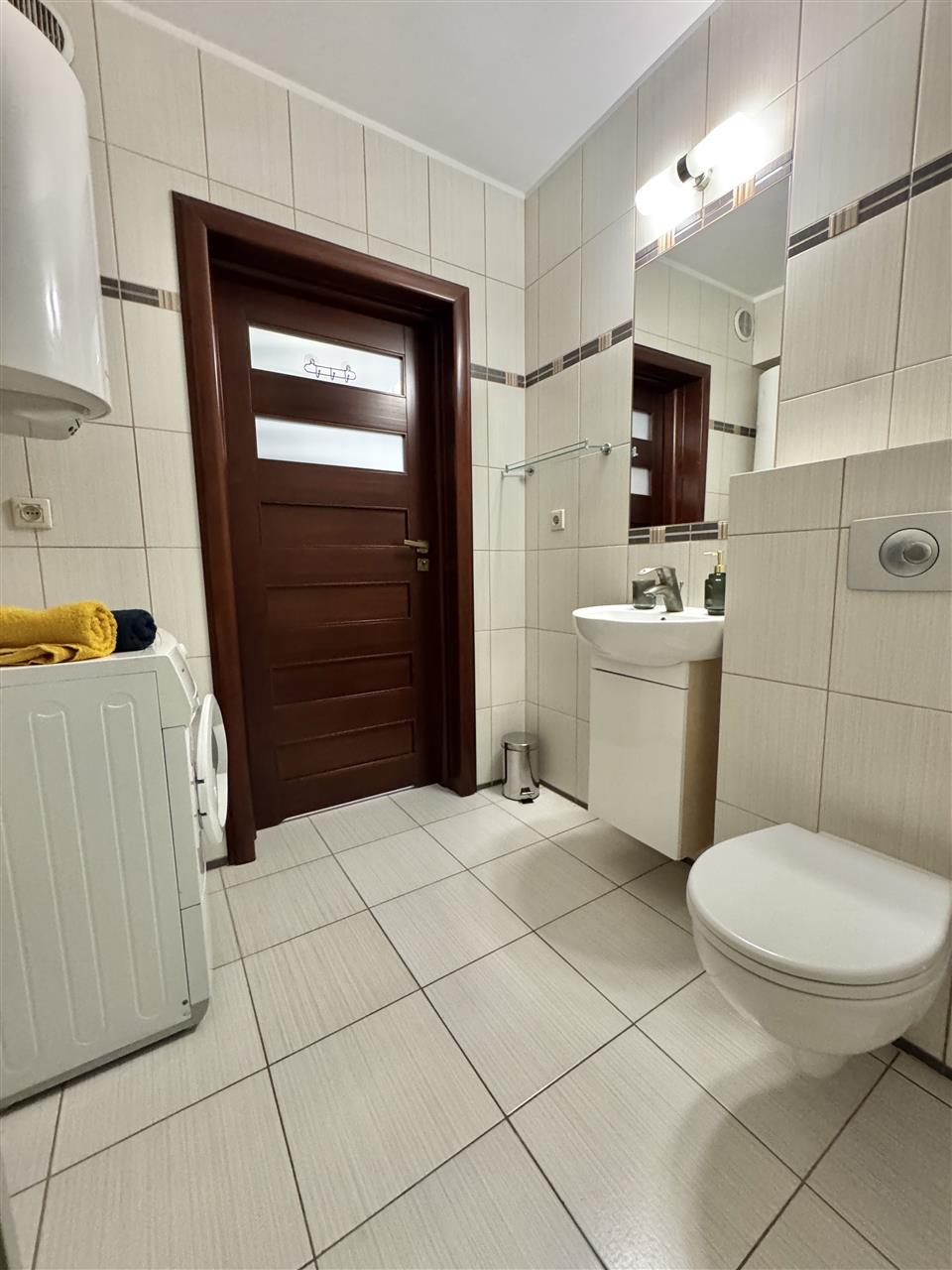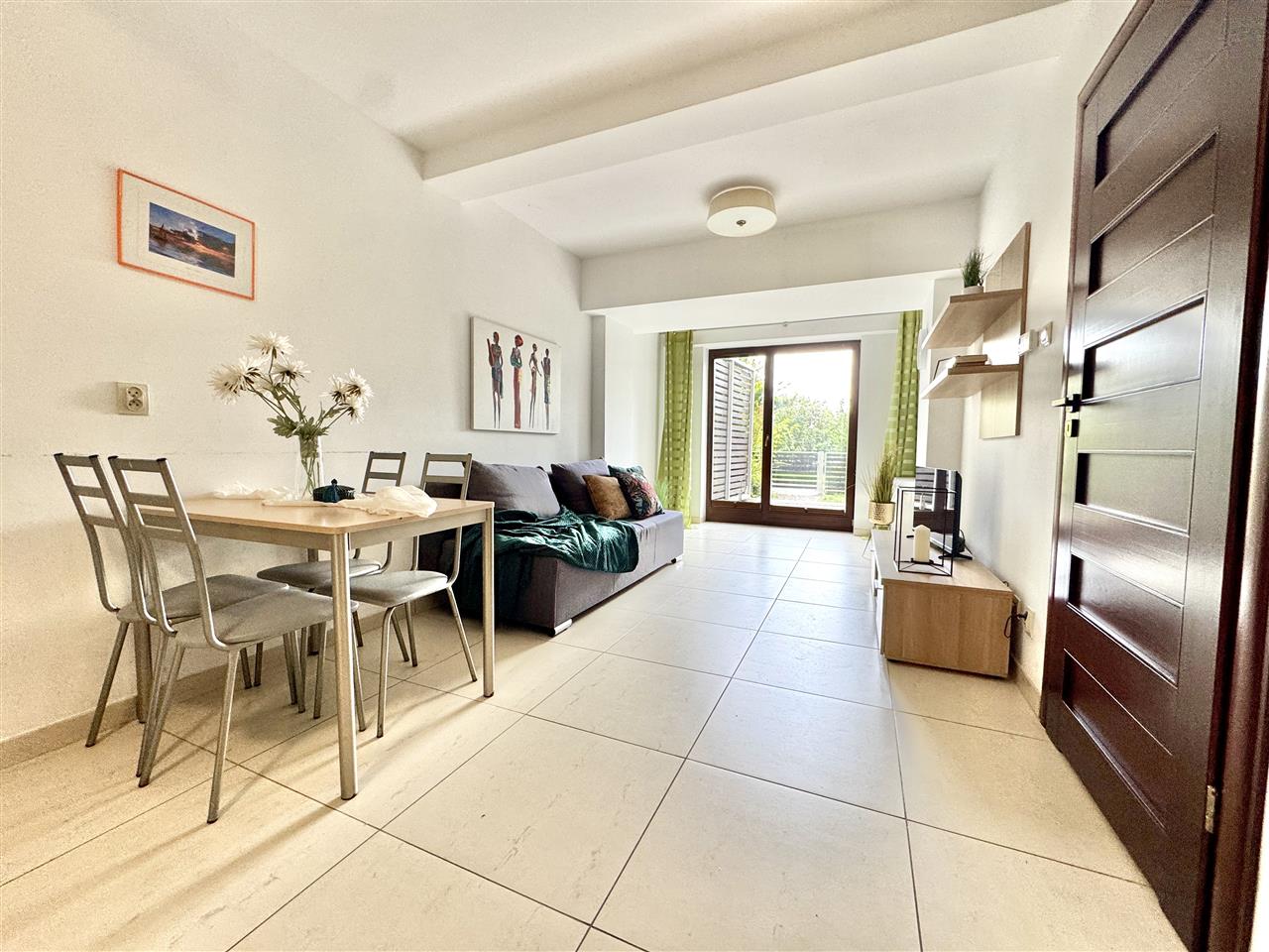Układ pomieszczeń: przestronny salon z aneksem kuchennym i wyjściem na piękny, słoneczny ogródek (ogródek w części zagospodarowany deską kompozytową a w części zielenią),sypialnia również z wyjściem na taras - sypialnia wyposażona w dwa łóżka oraz komodę,łazienka z kabiną prysznicową,przestronna garderoba z dużą ilością miejsca do przechowywania oraz przedpokój.