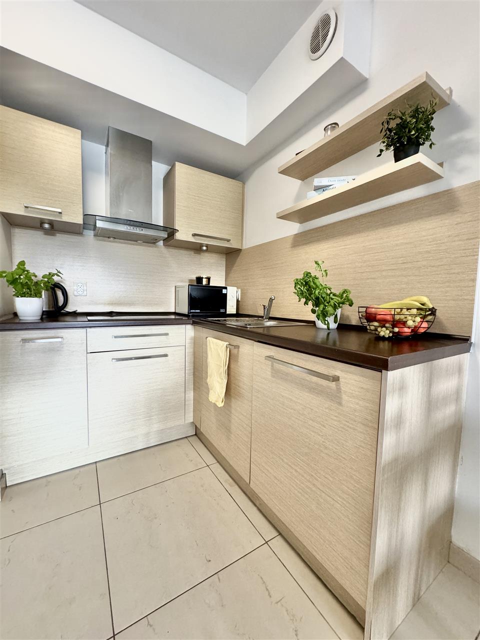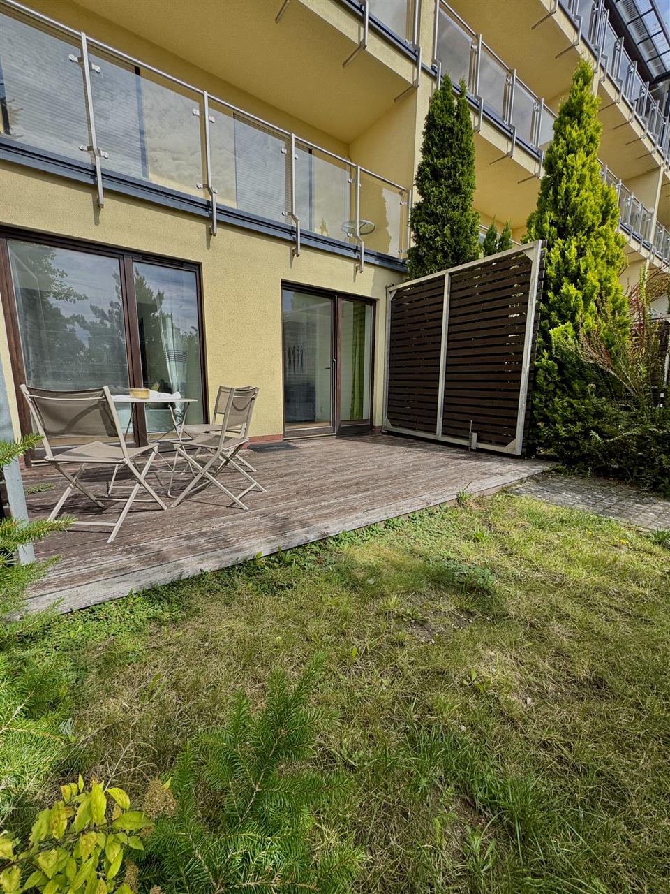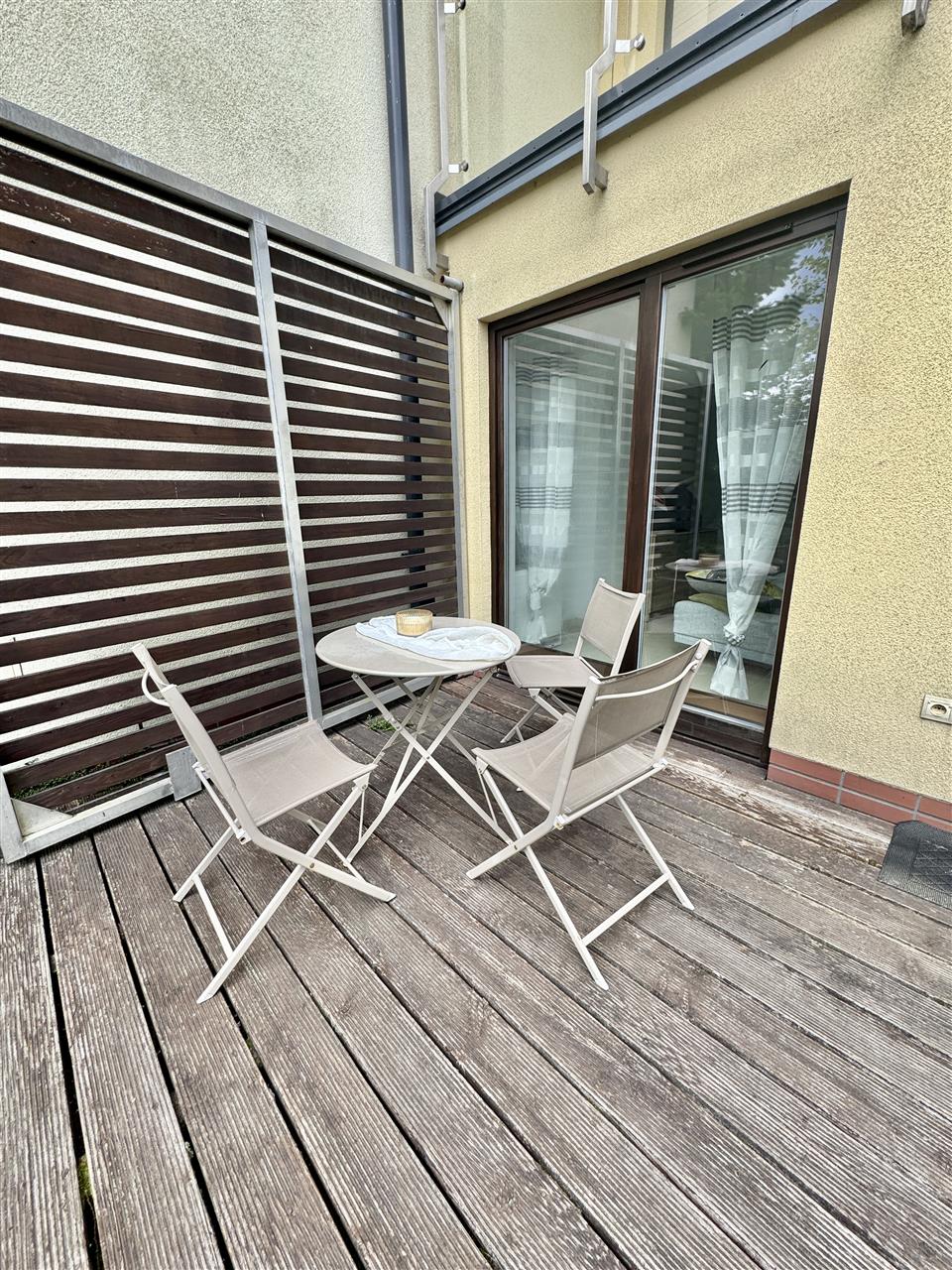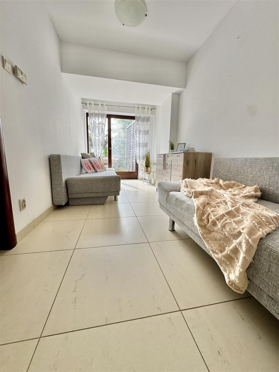 Układ pomieszczeń: przestronny salon z aneksem kuchennym i wyjściem na piękny, słoneczny ogródek (ogródek w części zagospodarowany deską kompozytową a w części zielenią),sypialnia również z wyjściem na taras - sypialnia wyposażona w dwa łóżka oraz komodę,łazienka z kabiną prysznicową,przestronna garderoba z dużą ilością miejsca do przechowywania oraz przedpokój.