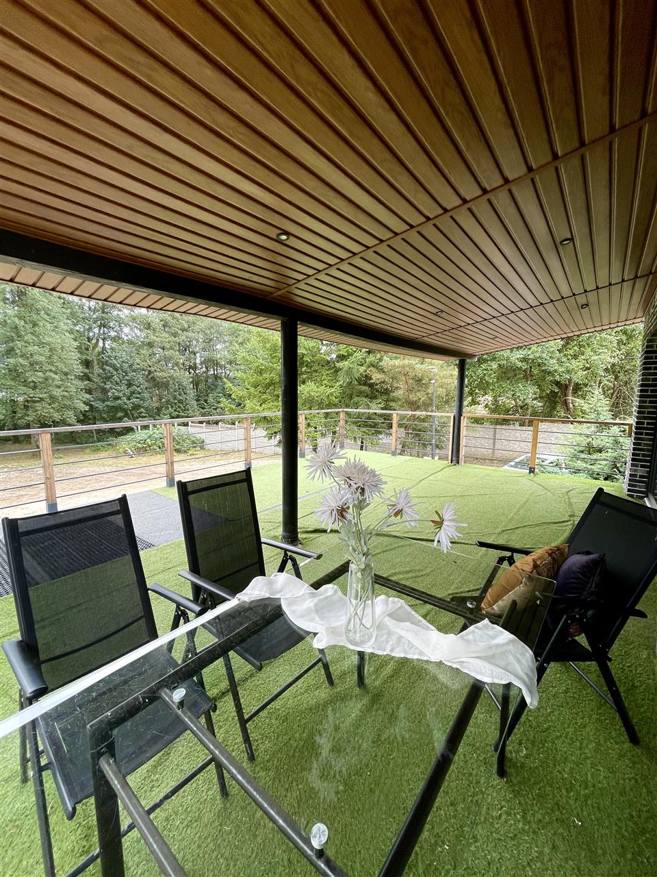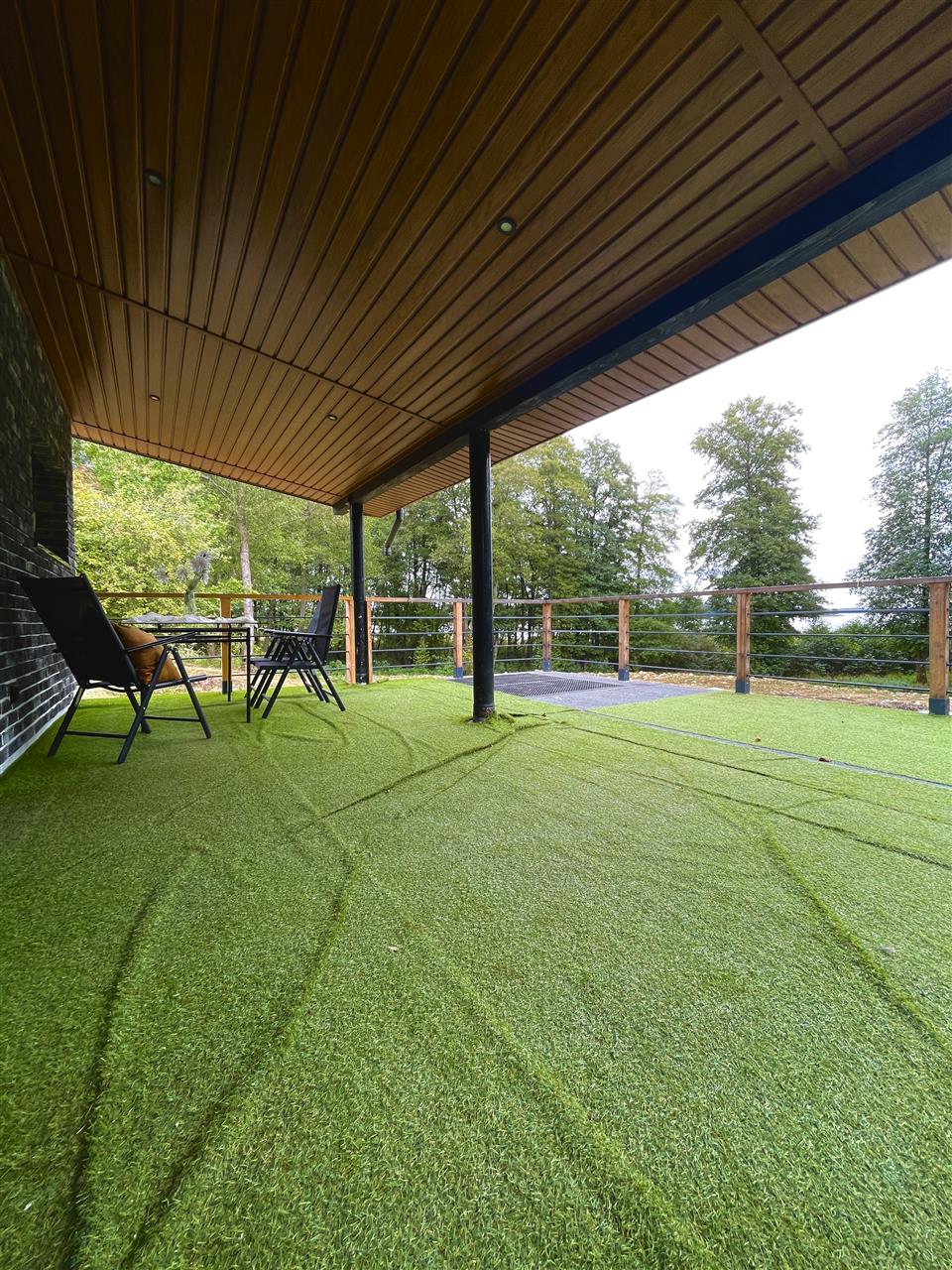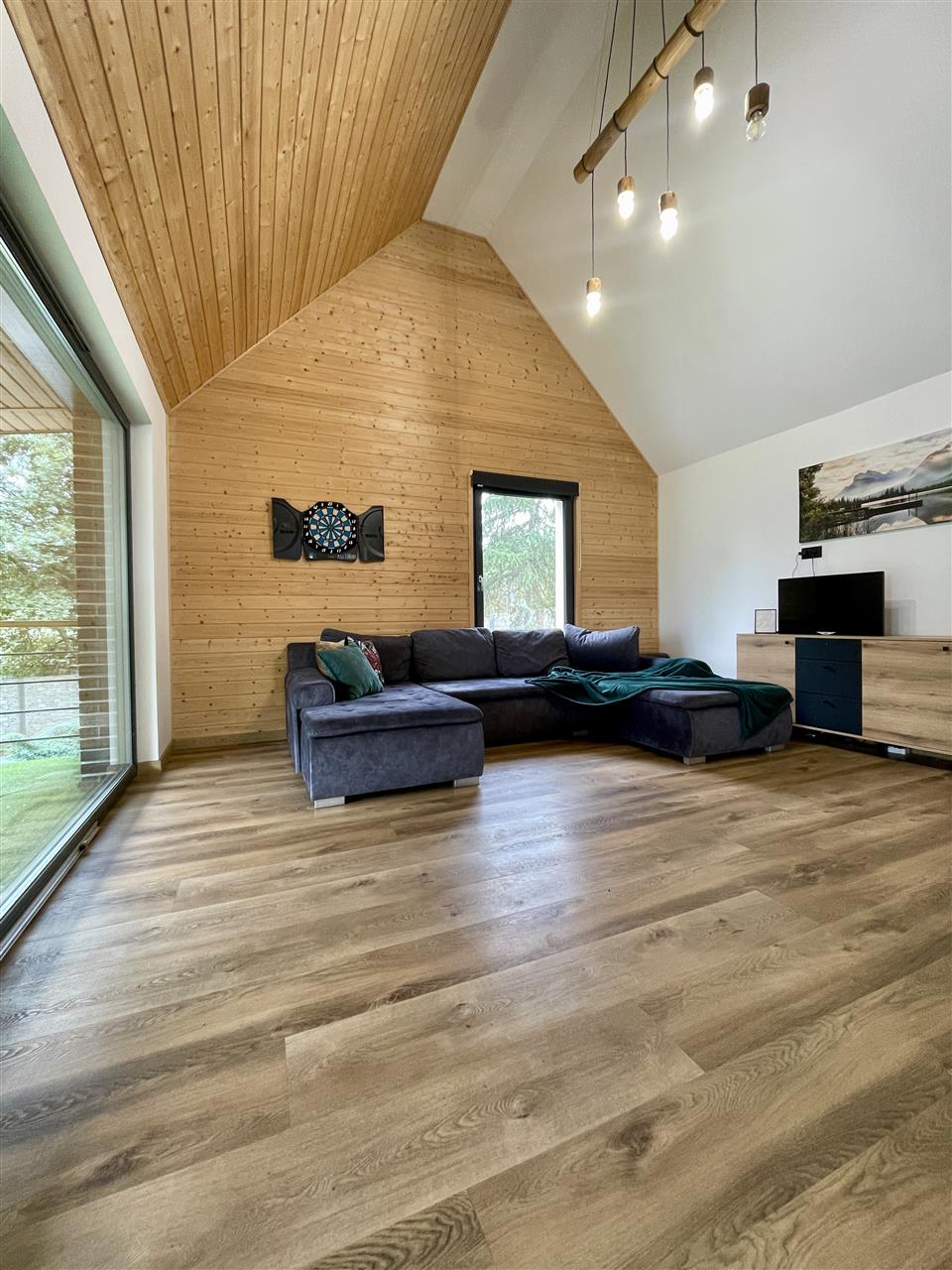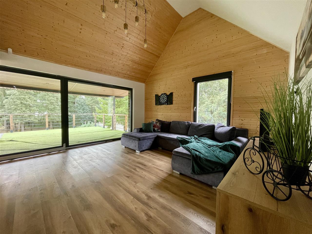 - Przestronny salon z dużymi przeszkleniami prowadzi na 50-metrowy taras z panoramicznym widokiem na taflę jeziora — idealny na poranną kawę, rodzinne spotkania czy romantyczne zachody słońca,