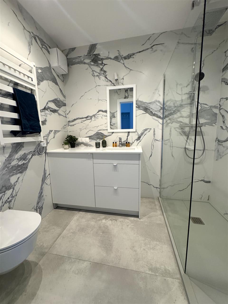 •pralka, grzejnik drabinkowy, nowoczesne oświetlenie i gres,