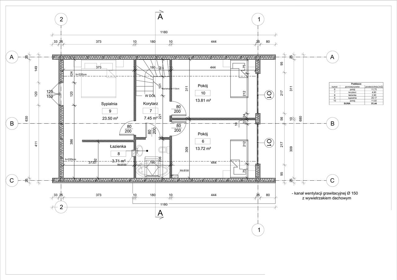 - strop międzykondygnacyjny drewniany z wypełnieniem akustycznym (wełna min.), obustronnie poszyty płytą OSB i płytą GK.