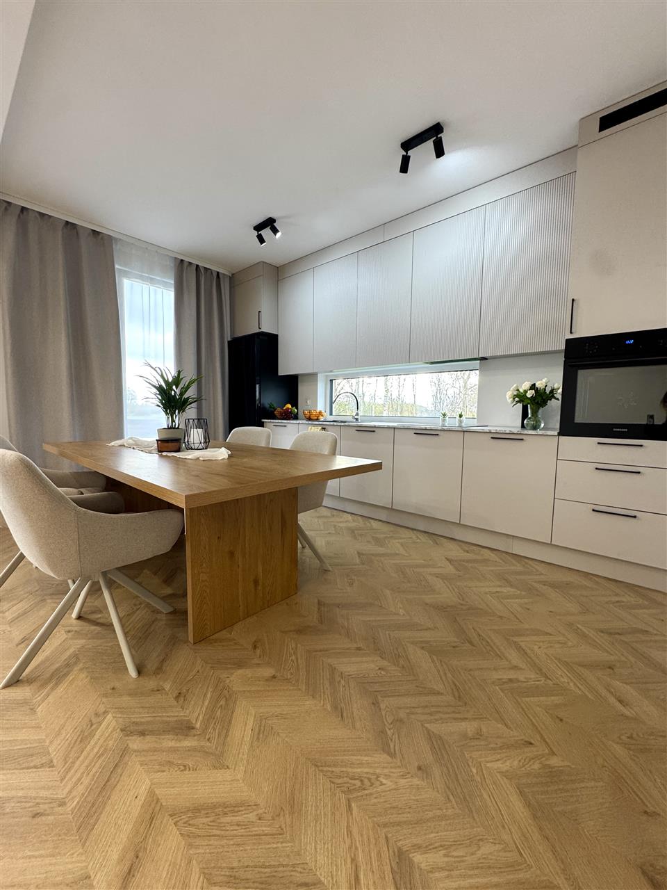 - kuchnia w zabudowie, z pełnym wyposażeniem AGD Samsung (płyta, piekarnik, lodówka, okap)