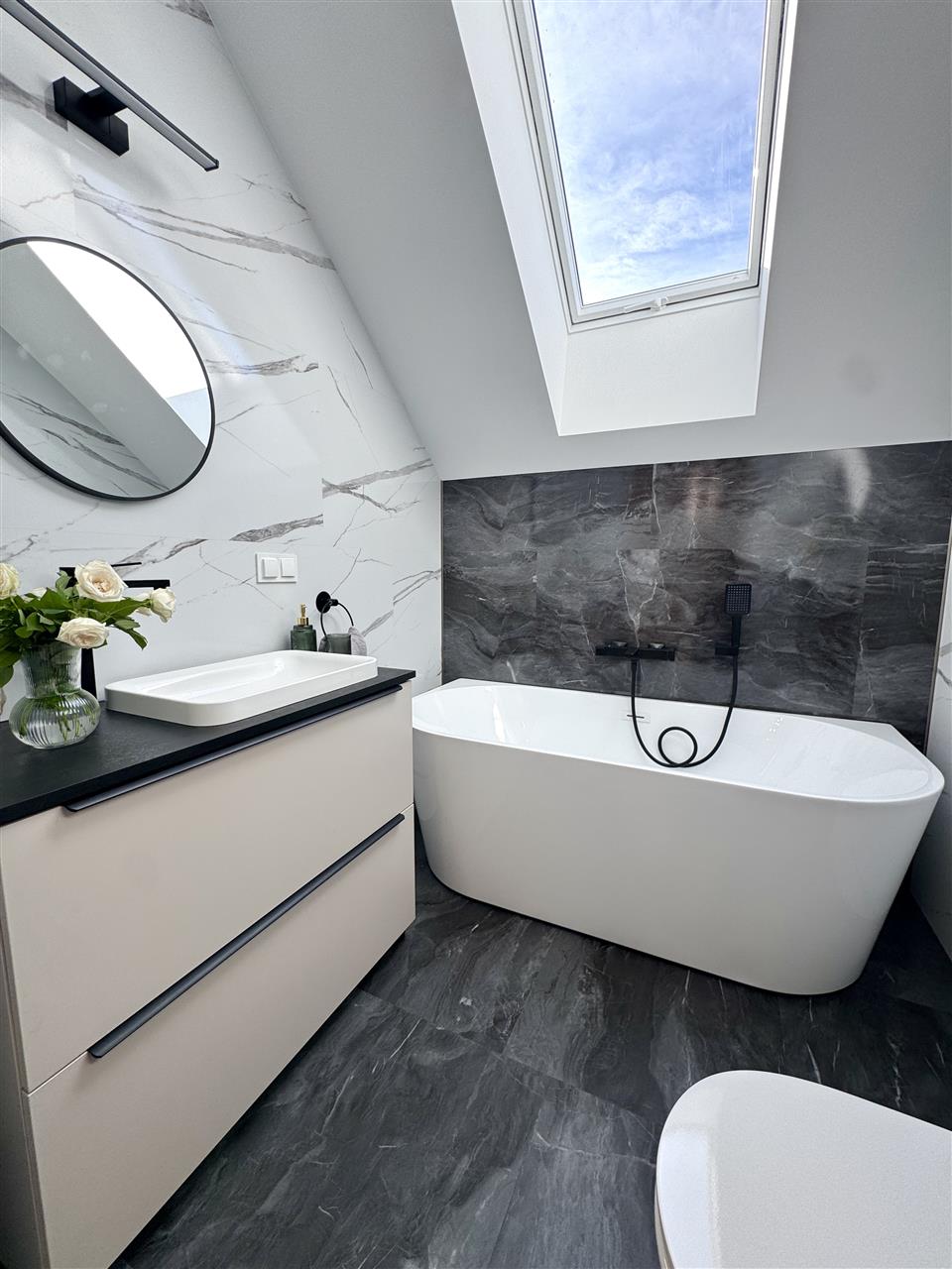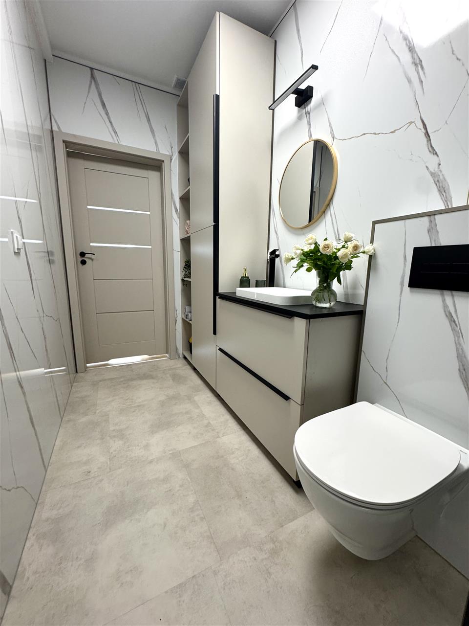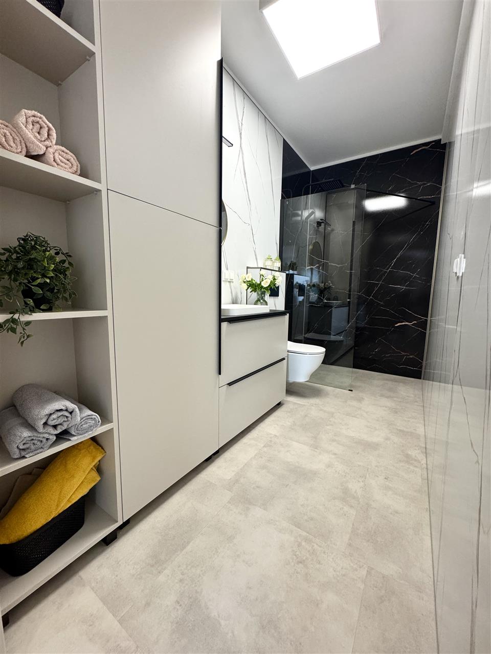 - łazienki w pełni wykończone: panele SPC, sufit GK, armatura, ceramika, kabina prysznicowa lub wanna, umywalka z szafką