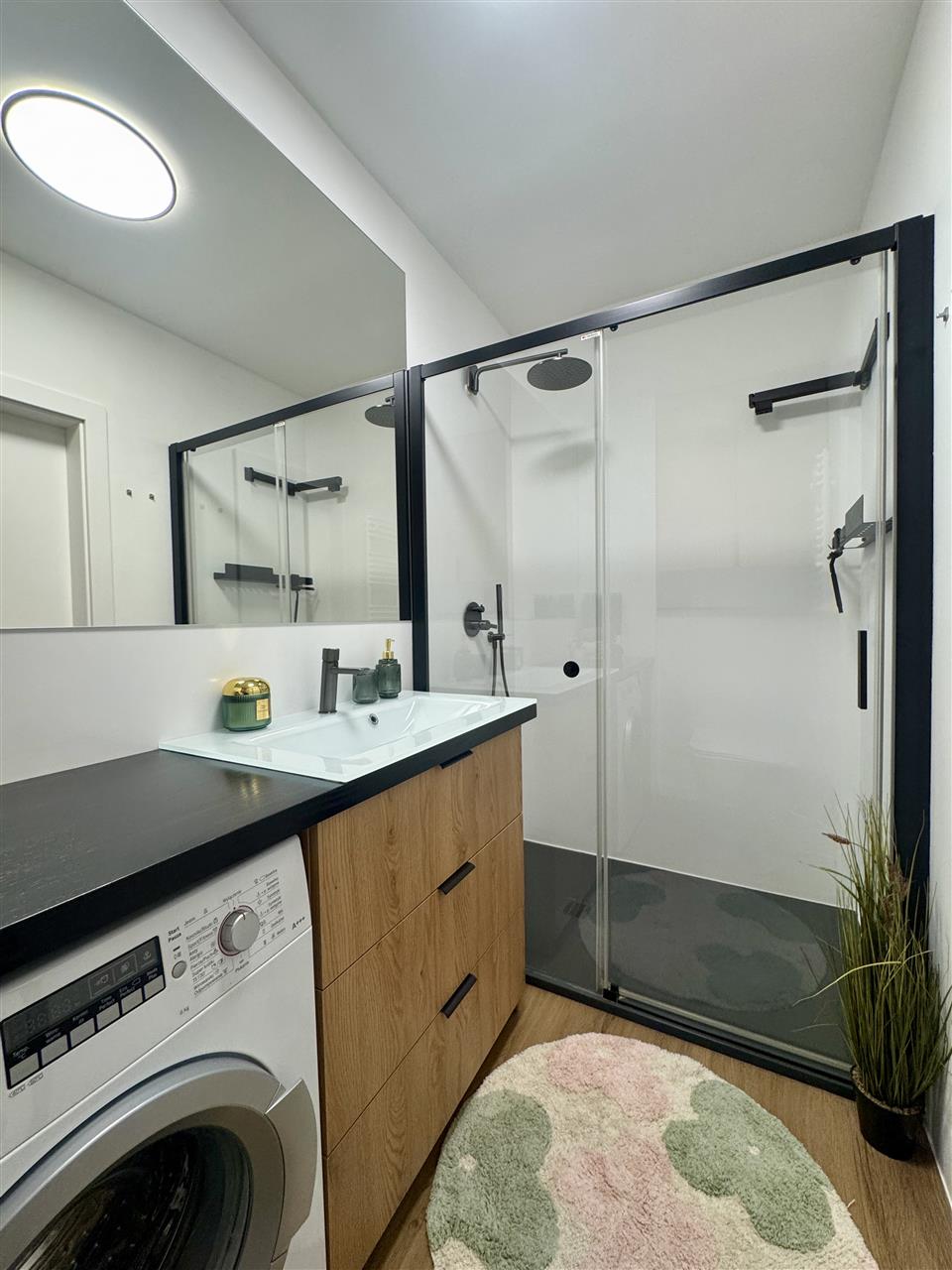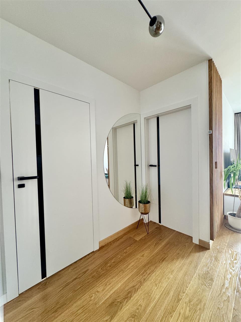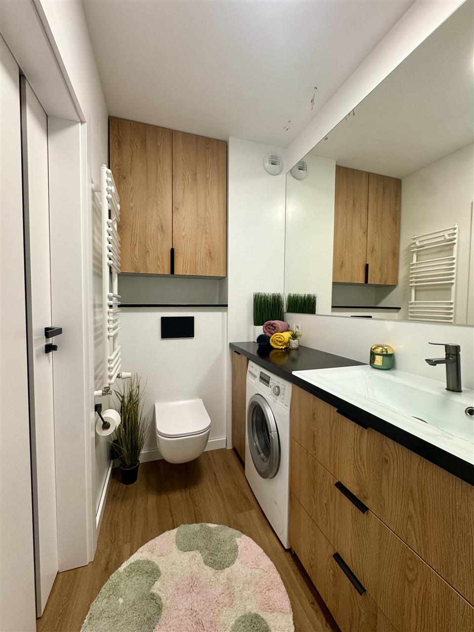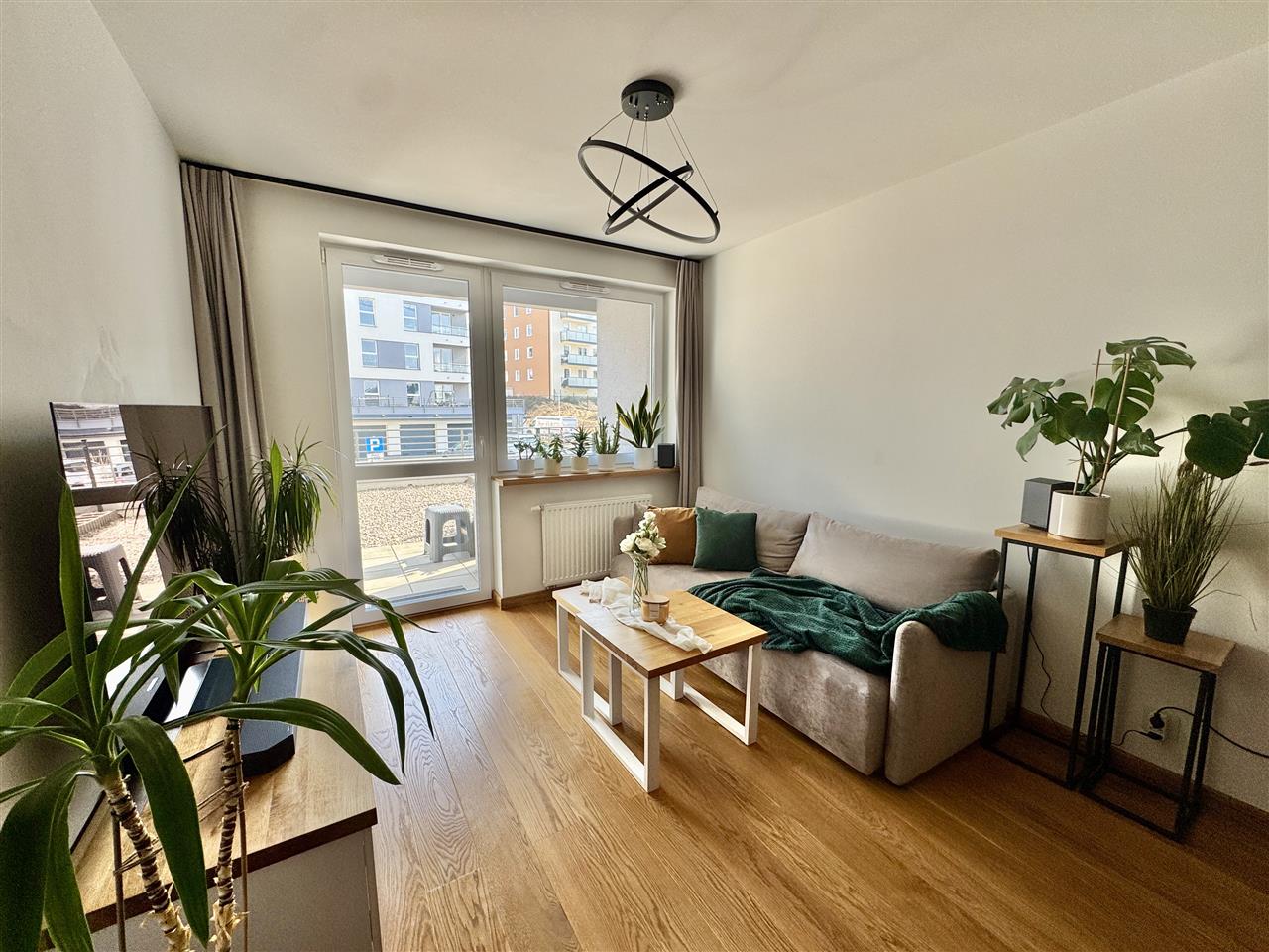 Mieszkanie zostało wykończone z dbałością o każdy detal, przy użyciu wysokiej jakości materiałów. Na podłogach położono naturalną deskę drewnianą, kuchnia wyposażona jest w drewniane blaty, a całość dopełniają solidne i eleganckie drzwi Porta. Wnętrze jest spójne, nowoczesne i gotowe do zamieszkania – bez konieczności ponoszenia dodatkowych nakładów finansowych.