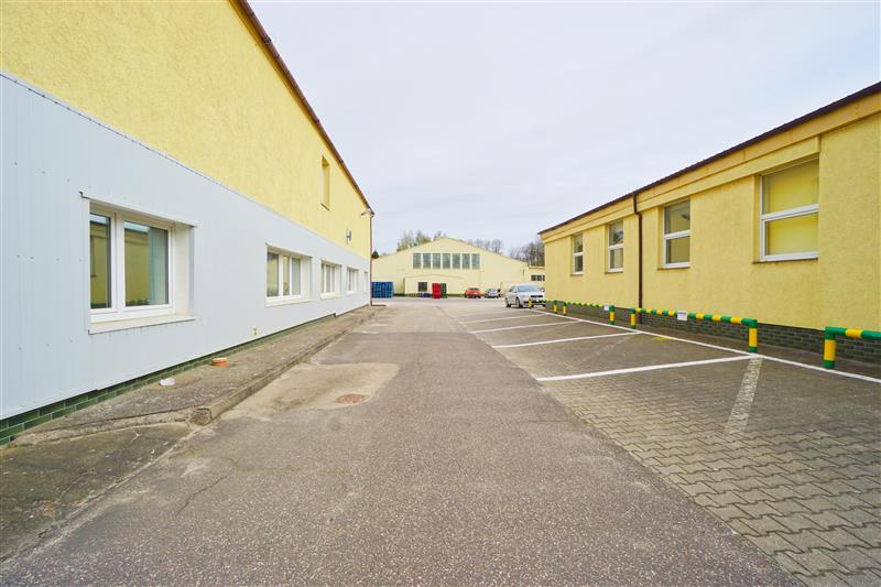 Wysokość hali 4,20m, wysokość pomieszczeń biurowych 3m.