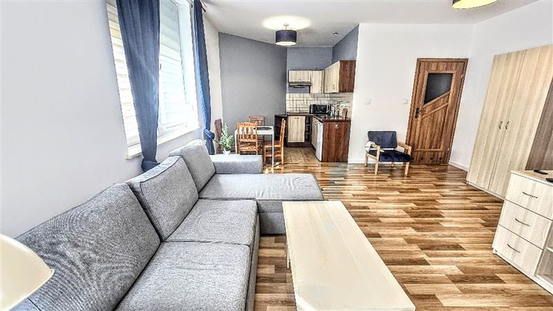 Bardzo ładnie doświetlony. W oknach żaluzje. Kuchnia zabudowa kuchenna, płyta indukcyjna, lodówka, mikrofala, czajnik elektryczny, stół, krzesła.