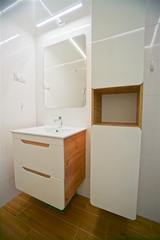 Sufity napinane w każdym pomieszczeniu o zróżnicowanej strukturze kolorystycznej ( w kuchni biały mat, w salonie białe elementy z czarnym w połysku, korytarze czarne, łazienki białe). Oświetlenie led wykorzystane w aranżacji wnętrza sterowane z poziomu aplikacji. Na podłogach panel oraz terakota w wiatrołapie i łazienkach. Łazienki wykonane w nowoczesnej aranżacji, jasne elementy łączone z drewnopodobną glazurą lub ciemną płytką. Ściany w kolorze białym.