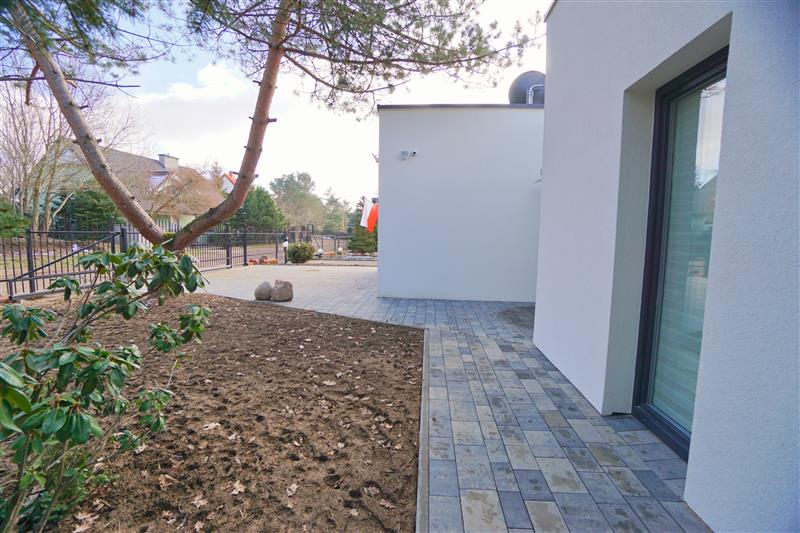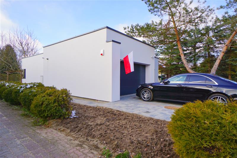 Nowy parterowy budynek o powierzchni użytkowej 139m2, o nowoczesnej bryle z płaskim dachem, najnowsze rozwiązania grzewcze.