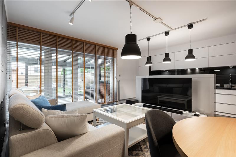 Na ścianach gładzie w kolorze w salonie płyty betonowe dekoracyjne.