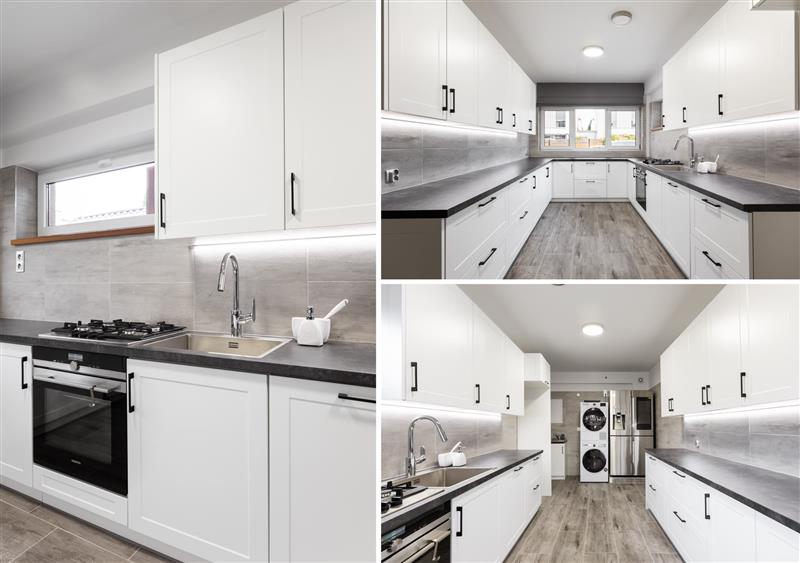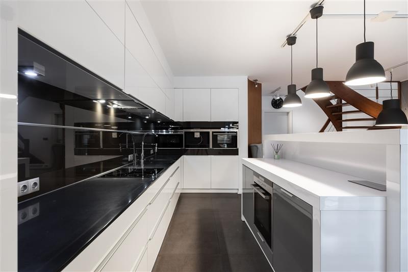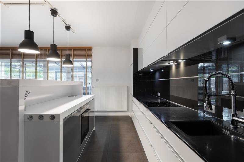 Parter obejmuje: wiatrołap z szafą w zabudowie, salon z aneksem kuchennym o powierzchni 34,57 m2, WC, druga kuchnia o powierzchni 17,22 m2 , która powstała po przebudowaniu pomieszczenia garażowego oraz piękny duży ogród zimowy, ogrzewany, w konstrukcji aluminiowej. Kuchnia w pełni wyposażona w sprzęt AGD: piekarnik elektryczny, piekarnik parowy, kawiarka w budowana, mikrofala, zmywarka, lodówka z zamrażalnikiem, płyta indukcyjna, młynek do odpadów.