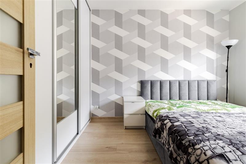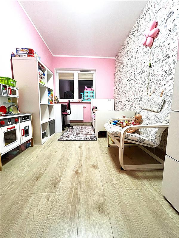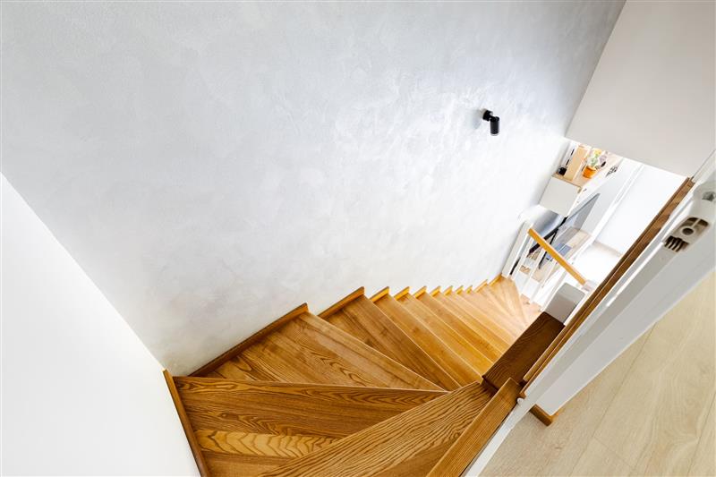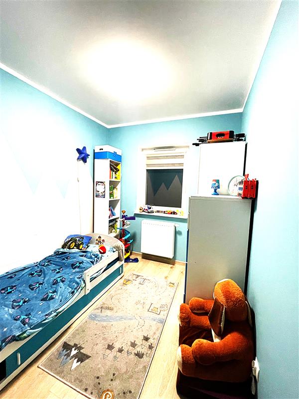 Ściany wygładzone, pomalowane w kolorze, w salonie jedna ze ścian wykonana w farbie strukturalnej. Na parterze podłoga winylowa, w łazience i wiatrołapie terakota, w pozostałych pomieszczeniach panele.