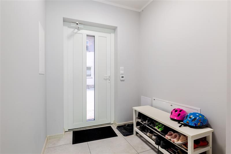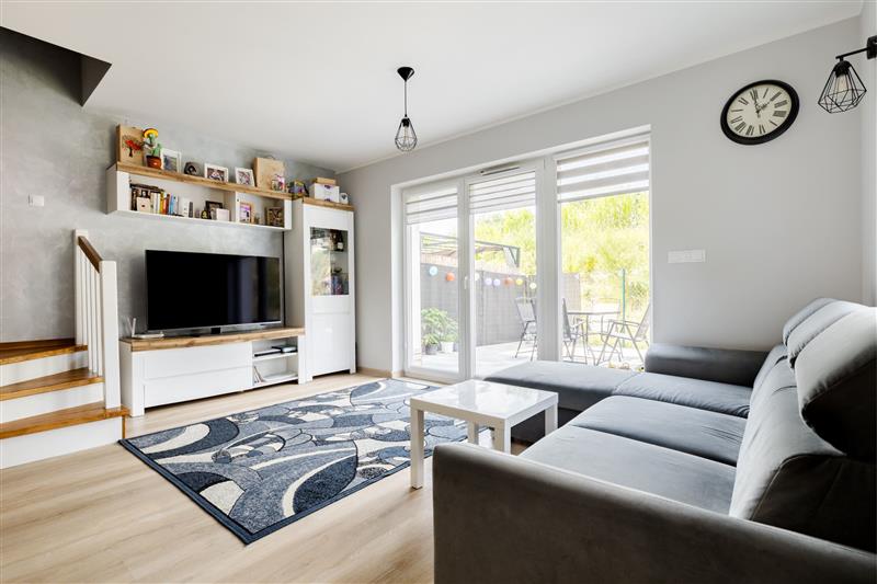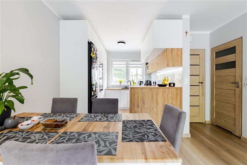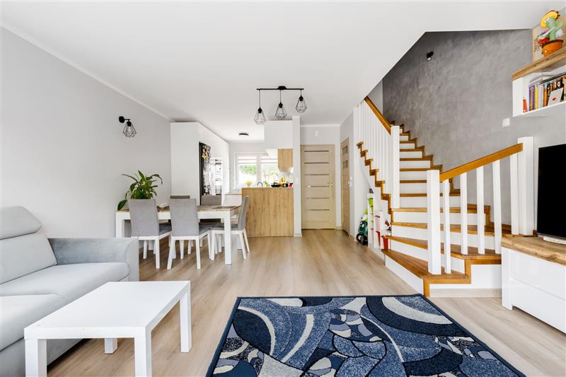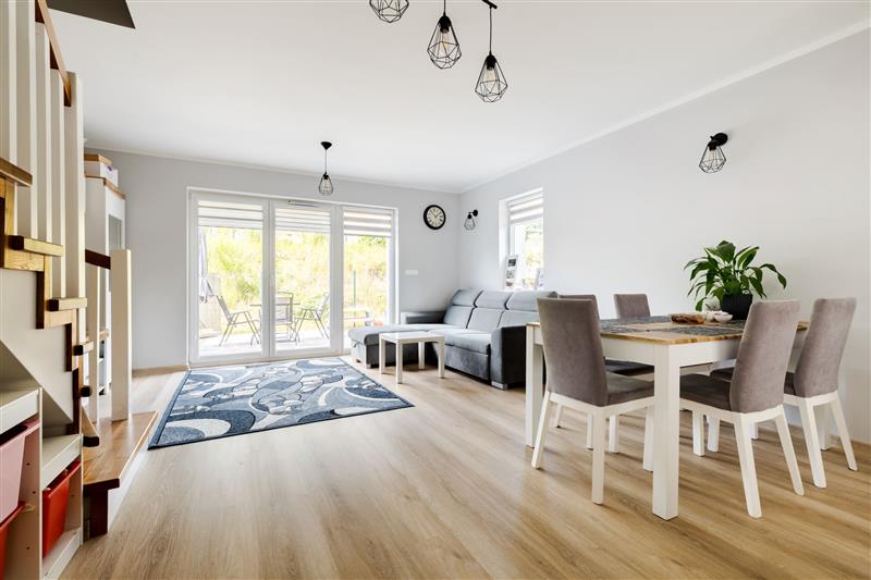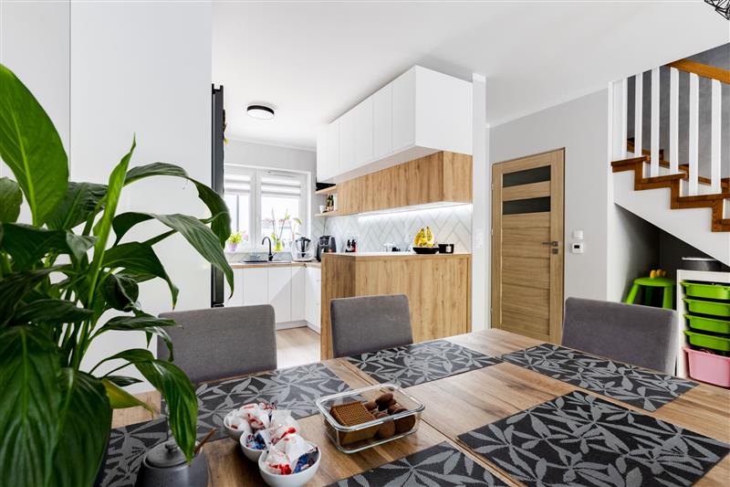 Na parterze znajduję się salon z wyjściem na taras, jadalnia, aneks kuchenny, wiatrołap oraz WC, wejście na piętro schodami jesionowymi wykonanymi pod wymiar.