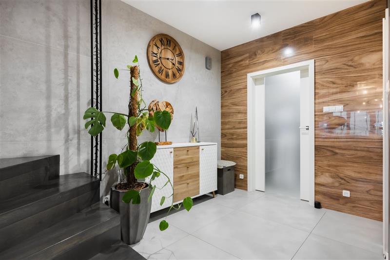 zabudową aluminiową, schody drewniane w kolorze szaro-antracytowej, wnętrze zostało