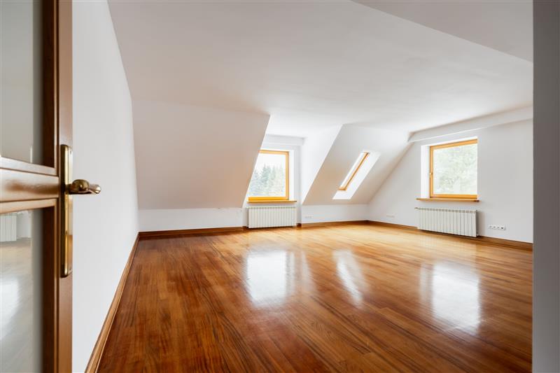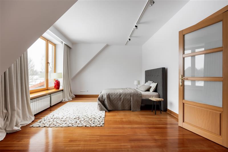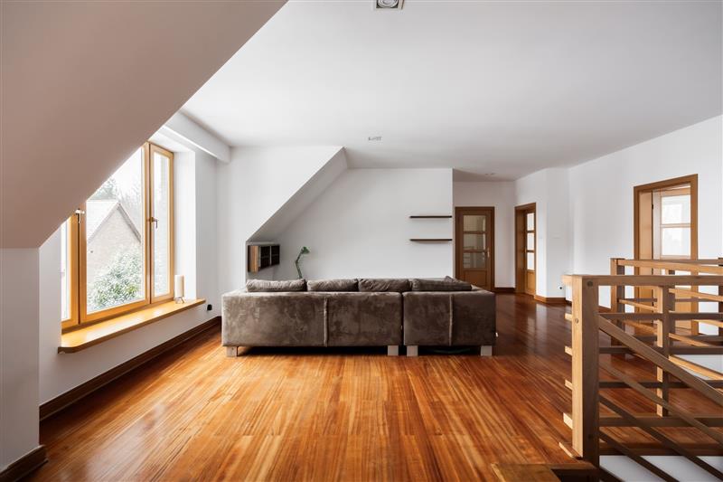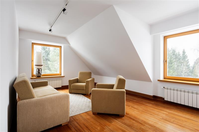 Na piętrze w każdym pomieszczeniu są skosy.