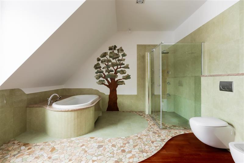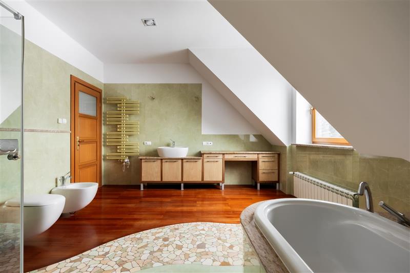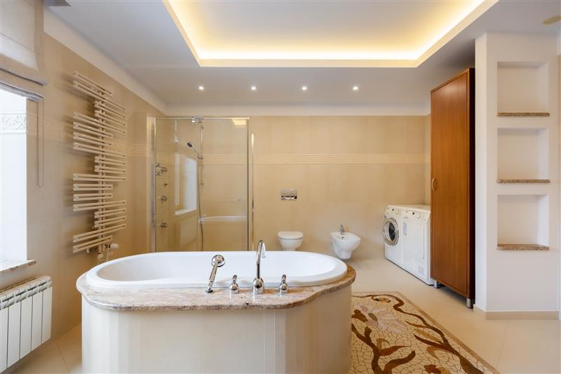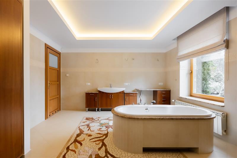Łazienka (wanna, z osobną dużą kabiną prysznicową z hydromasażem, wc, bidet, umywalka oraz szafka z blatem marmurowym)