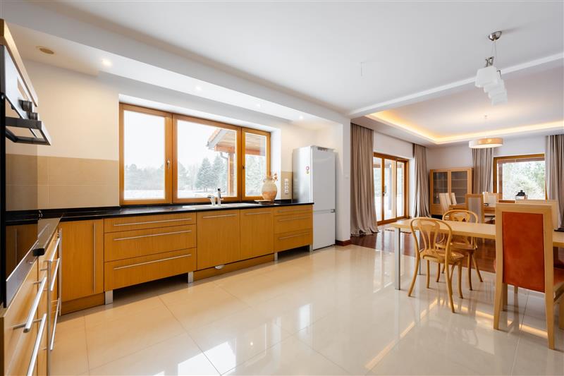 Kuchnia z dużym oknem i z widokiem na ogród, połączona z hallem i z salonem. Z kuchnią jest połączona również bardzo poręczna i praktyczna ciemna i chłodna spiżarnia. Spiżarnia wyposażona jest w zlew warzywny oraz regały. Cały sprzęt AGD z firmy MIELE