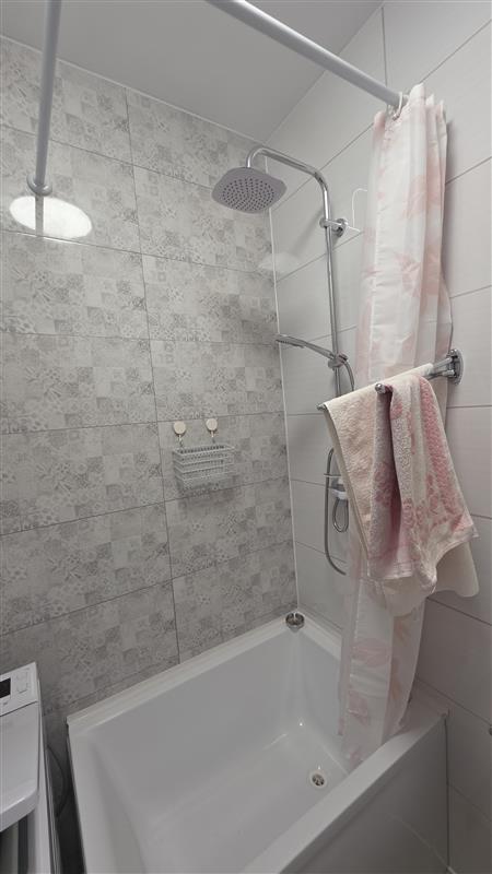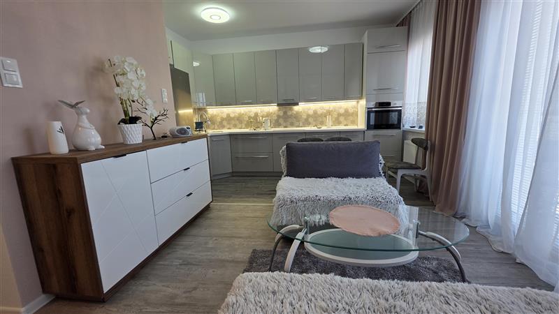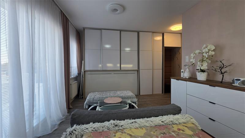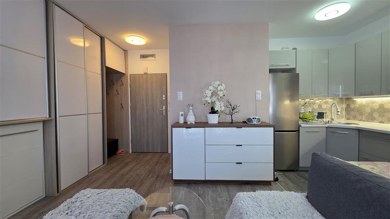Mieszkanie składa się z przestronnego pokoju z aneksem kuchennym. Wnętrze zostało zaprojektowane z myślą o wygodzie – zastosowano nowoczesną zabudowę, która sprytnie ukrywa łóżko, dzięki czemu przestrzeń w ciągu dnia pozostaje otwarta i estetyczna. Dodatkowo w salonie znajduje się zestaw wypoczynkowy z rozkładaną kanapą.