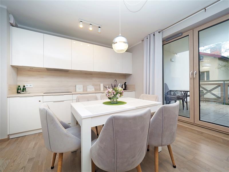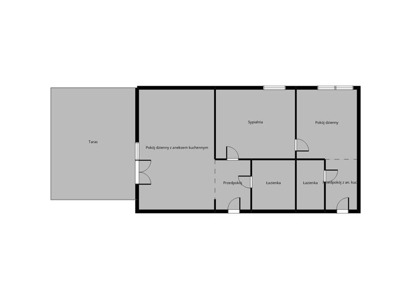 Lokal składa się z pokoju z aneksem kuchennym, przedpokoju z aneksem kuchennym, 2 pokoi, 2 łazienek i przedpokoju. Z salonu wyjście na duży, częściowo zadaszony taras o powierzchni 22,10 m2.