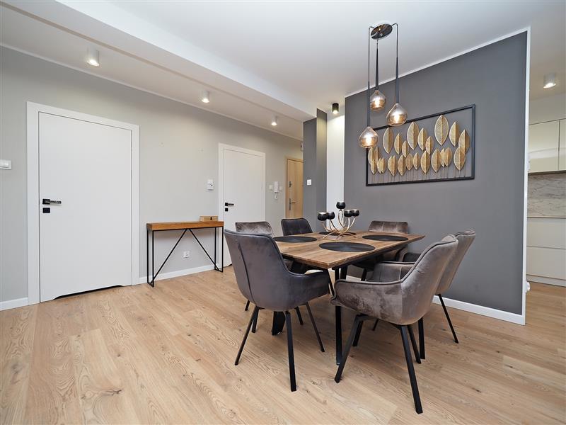 Z innych atutów mieszkania należy wspomnieć o przestronnej kuchni pod wymiar z blatami ze spieku kwarcowego, sprzętem AGD wysokiej klasy oraz wygospodarowanym miejscu na pralkę i suszarkę. Na tarasie wypoczynkowe meble ogrodowe.