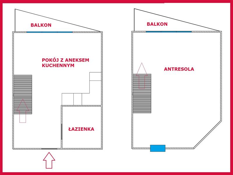 - na drugim poziomie duży pokój jako otwarta przestrzeń z możliwością wydzielenia kolejnej sypialni oraz wyjście na drugi balkon.
