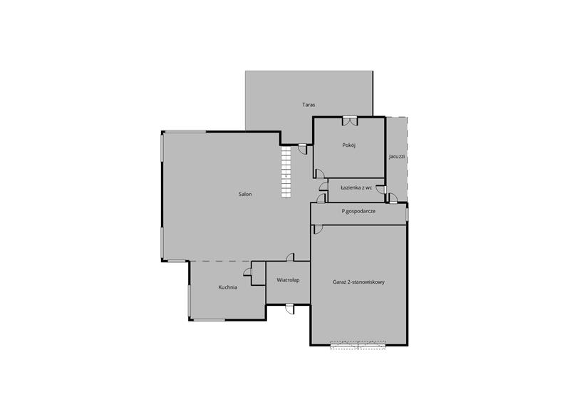 Na parterze znajduje się przestronny wiatrołap, kuchnia, tuż obok spiżarnia, duży salon z jadalnią, pokój gościnny, łazienka z wyjściem na zewnątrz, gdzie znajduje się jacuzzi z przeciwprądem, pomieszczenie gospodarcze z kotłownią i pralnią oraz 2-stanowiskowy garaż (30,8 m2).