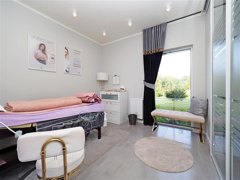 Kuchnia wykonana przez firmę Formi z kamiennymi blatami i złotymi elementami dekoracyjnymi. Wyposażona w wysokiej klasy sprzęt firmy Siemens ze sterowaniem przez WIFI. W cenie sprzęt AGD w zabudowie, czyli piekarnik z funkcją mikrofali, zmywarka, ekspres do kawy i pochłaniacz nablatowy. Łazienka i wc wykończona płytkami firmy Tubądzin, armatura firmy Hansgrohe. Drzwi wewnętrzne firmy Porta montowane przez firmę Domstyl, włączniki dotykowe firmy Simon.