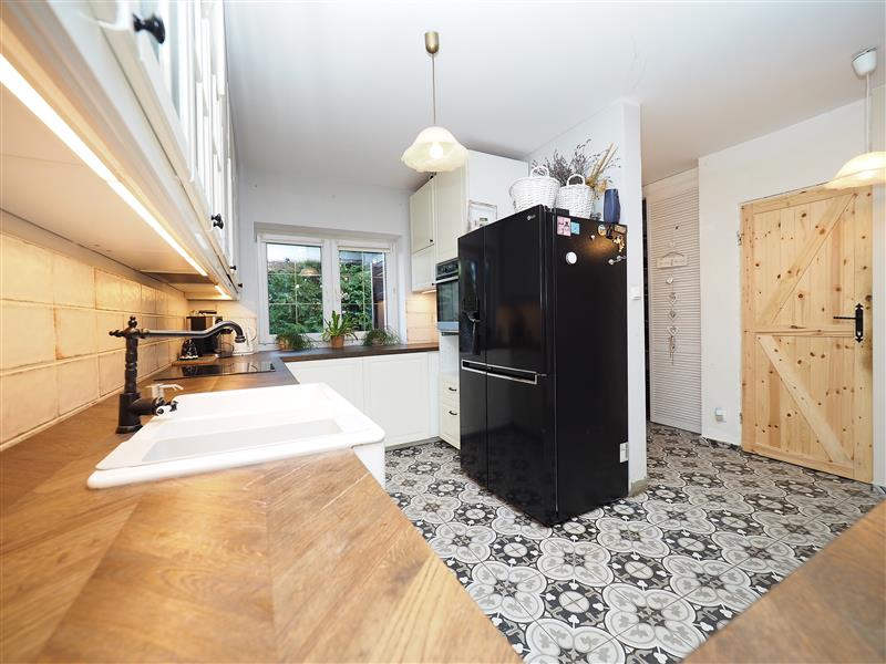 Część dzienna domu po niedawnym remoncie. Z salonu wyjście na taras poprzez duże, przesuwne drzwi tarasowe, a następnie schodami na ogród.