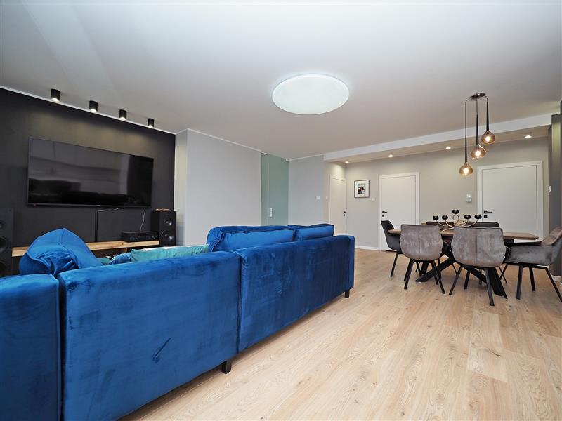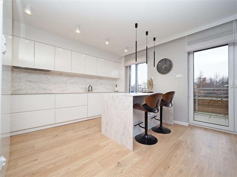 Z innych atutów mieszkania należy wspomnieć o przestronnej kuchni pod wymiar z blatami ze spieku kwarcowego, sprzętem AGD wysokiej klasy oraz wygospodarowanym miejscu na pralkę i suszarkę.
