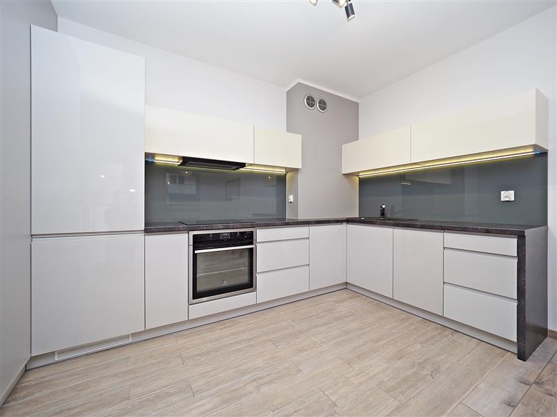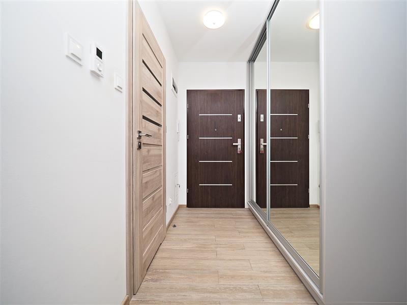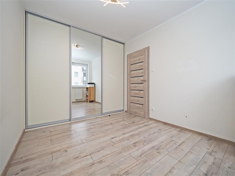 Kuchnia wraz ze sprzętem AGD (piekarnik, płyta, zmywarka, lodówka). W korytarzu oraz sypialni duże szafy na wymiar.