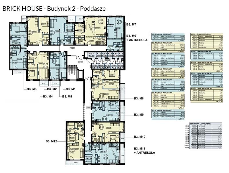 Mieszkanie B3.M6 składa się z salonu połączonego z aneksem kuchennym o pow. 33.13 m2, pokoju o pow. 10.04 m2, łazienki o pow. 4.51 m2 i korytarza o pow. 6.68 m2, antresoli o pow. 16.06 m2. Mieszkanie posiada balkon o pow. 3.90 m2.