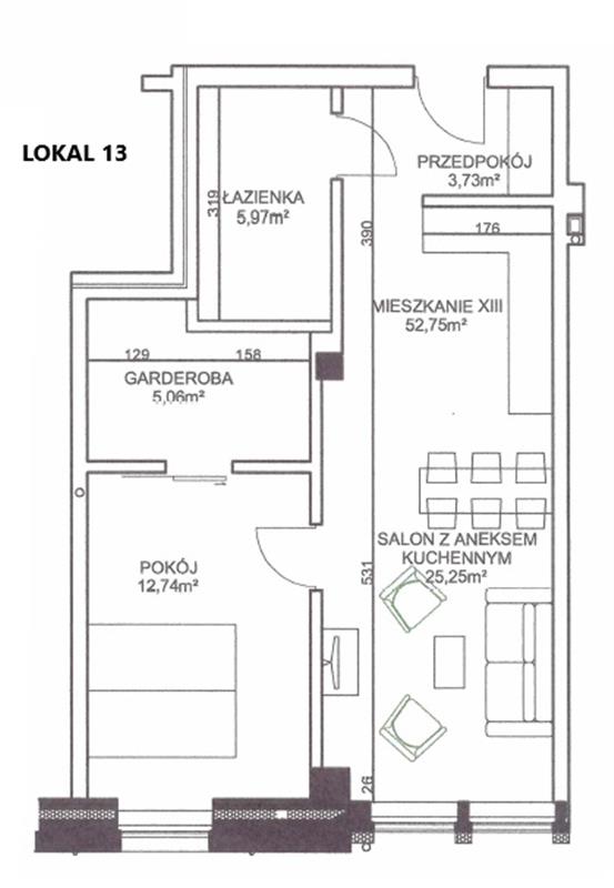 Lokal mieszkalny nr 13, piętro 1 - 52,75 m2 : salon z aneksem kuchennym 25,25 m2, garderoba 5,06 m2, pokój 12,74 m2, łazienka 5,97 m2, przedpokój 3,73 m2 – posiada balkon