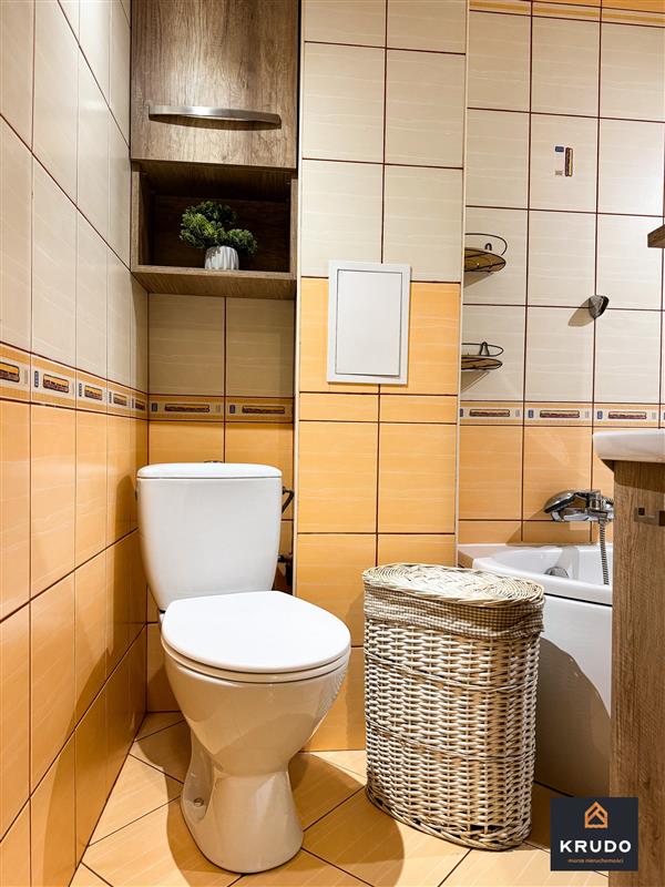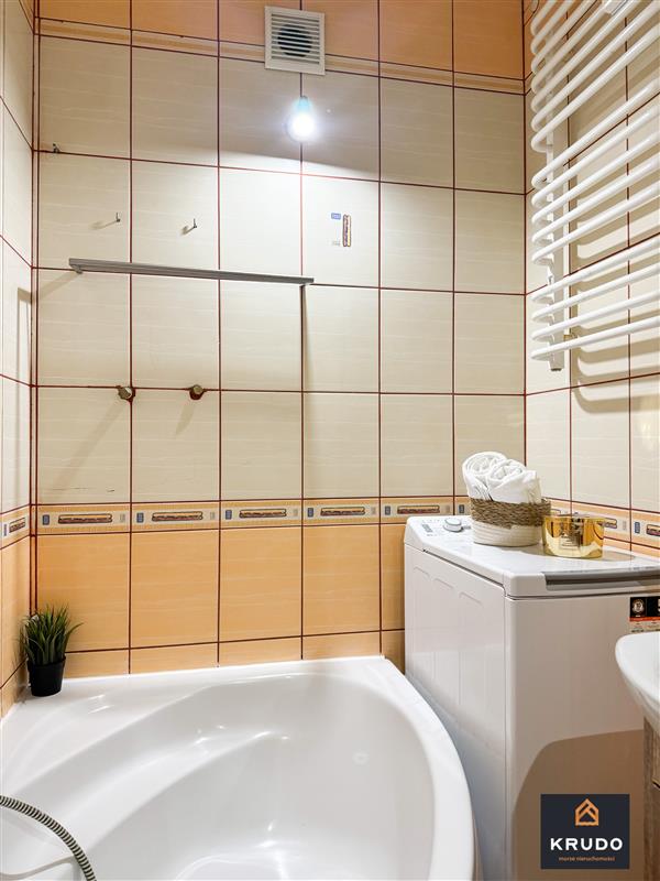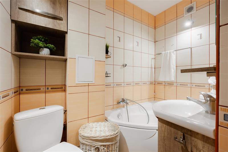 • duża łazienka z wanną, wyposażona w pralkę oraz kosz na pranie,