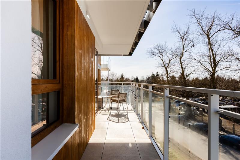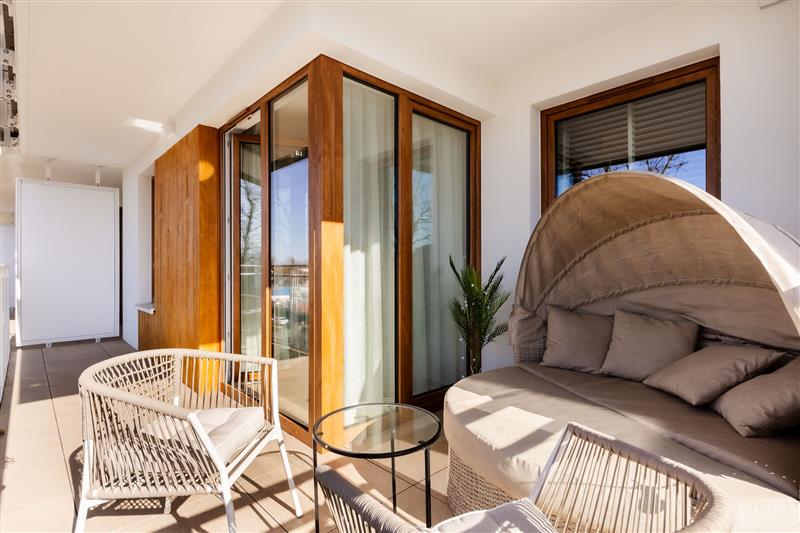 Mieszkanie zostało urządzone w wysokim standardzie, w nowoczesnym stylu i sprzedawane jest z wyposażeniem. Dużym atutem jest także przestronny balkon o powierzchni 11,56 m2, który zapewnia dodatkową przestrzeń do wypoczynku.