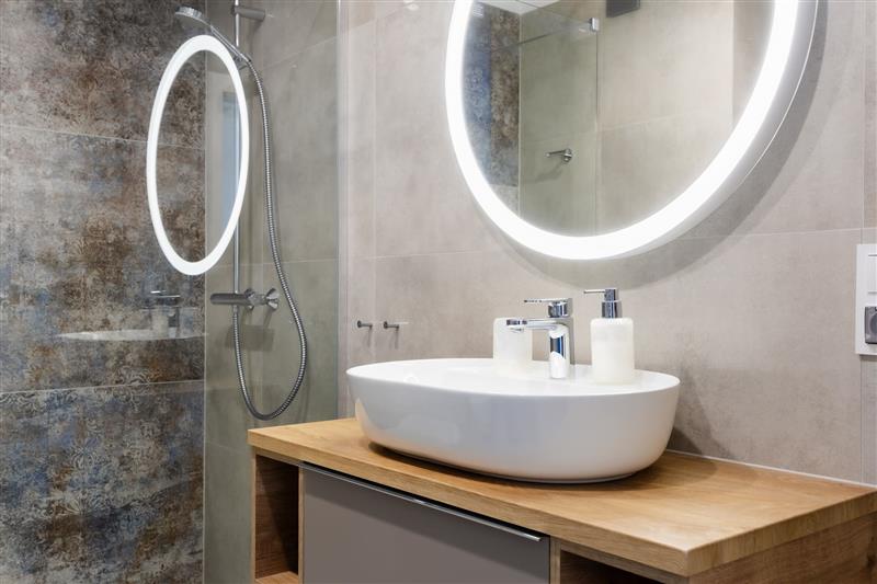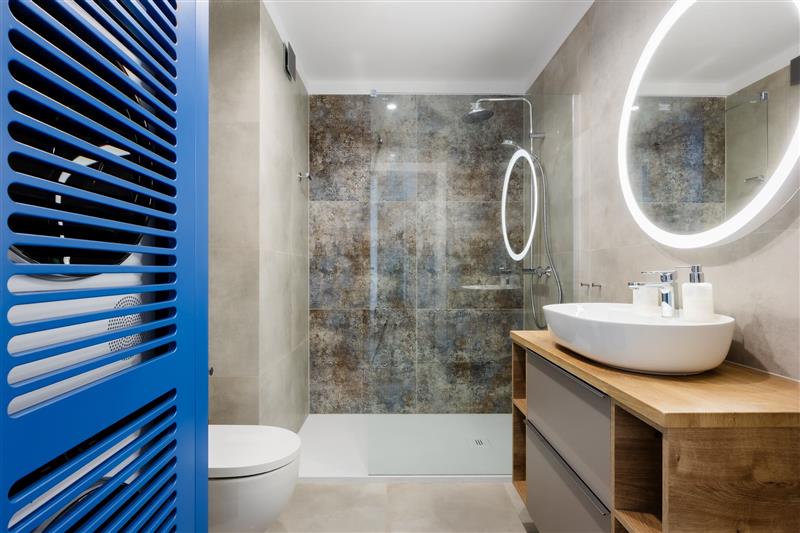 Łazienka wykończona w nowoczesnym stylu wyposażona jest w prysznic.