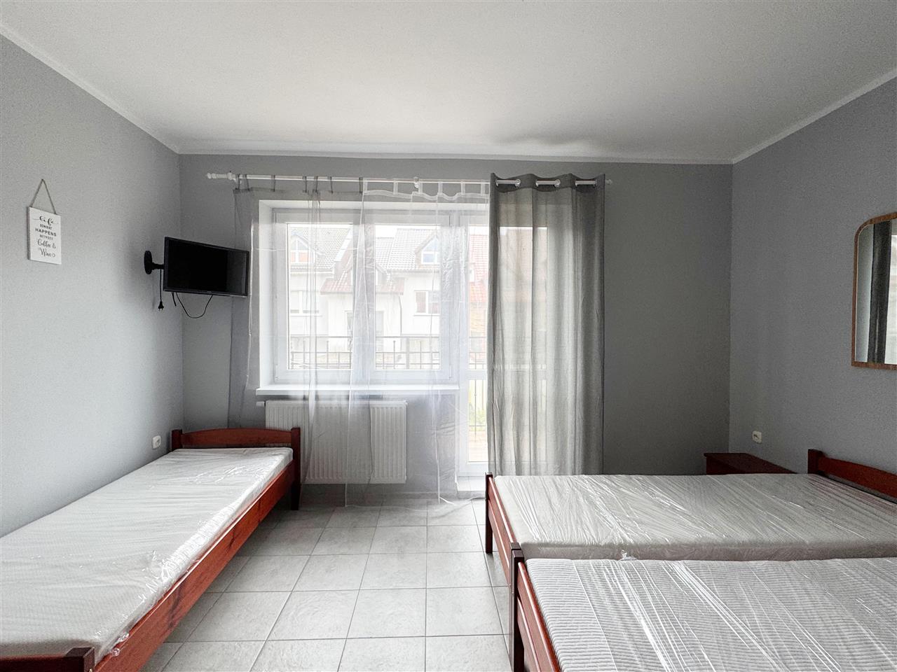 Pokoje z łazienkami, wyposażone w pojedyncze łóżka, materace, szafy oraz telewizory.