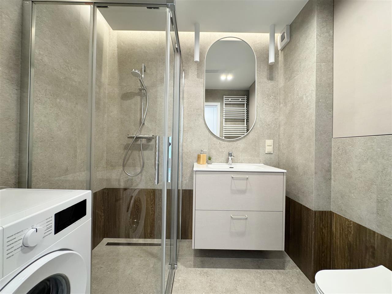 Łazienka wyposażona w nowoczesną armaturę, prysznic i pralkę.