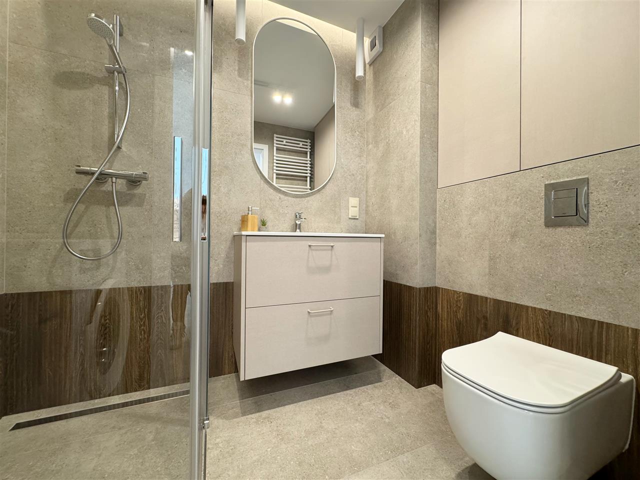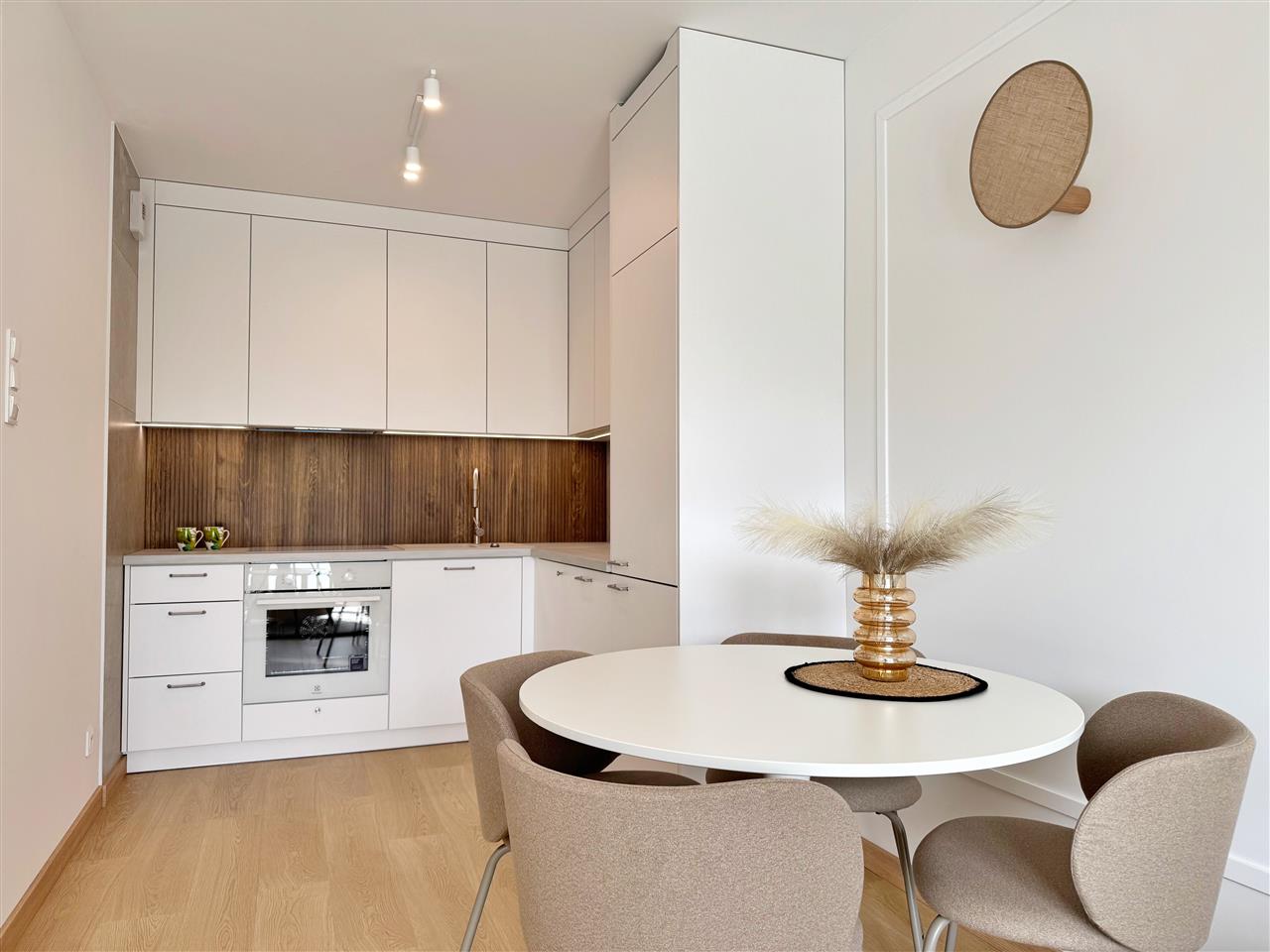Mieszkanie zostało wykończone z dbałością o najmniejsze detale, przy użyciu wysokiej klasy materiałów. Podłogi wyłożono drewnopodobnymi panelami, a ściany utrzymano w neutralnych kolorach, co nadaje wnętrzu nowoczesny i przyjazny charakter.