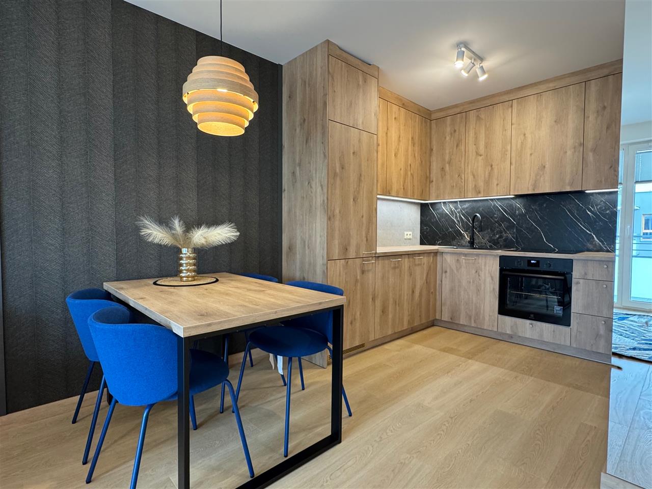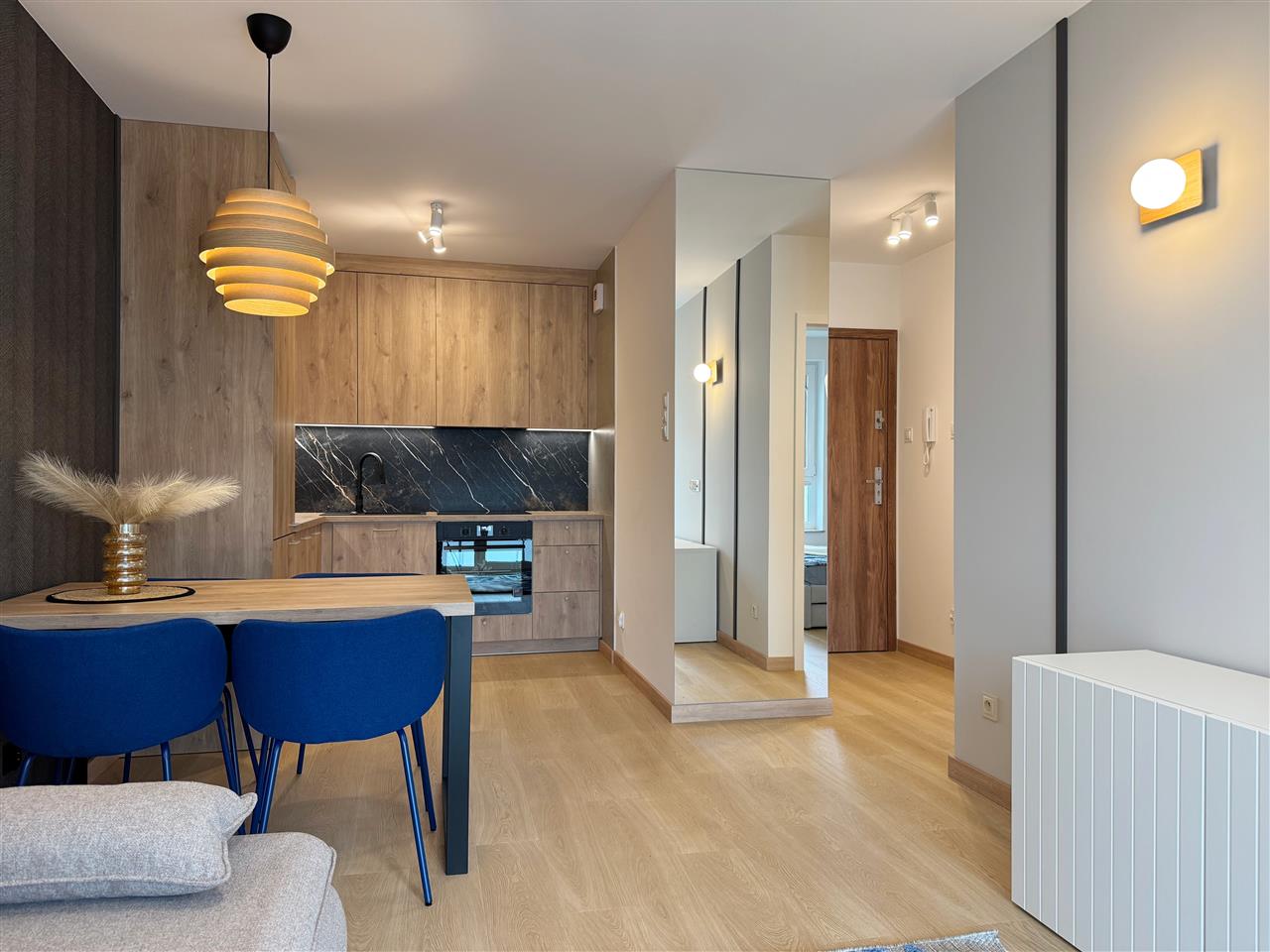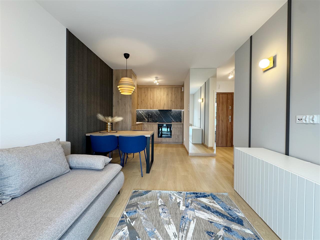 Mieszkanie zostało wykończone z dbałością o najmniejsze detale, przy użyciu wysokiej klasy materiałów. Podłogi wyłożono drewnopodobnymi panelami, a ściany utrzymano w neutralnych kolorach, co nadaje wnętrzu nowoczesny i przyjazny charakter.