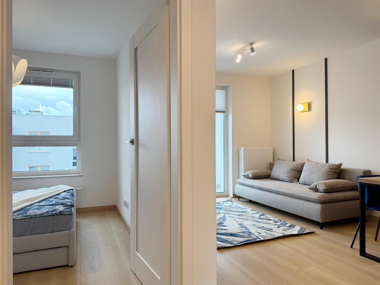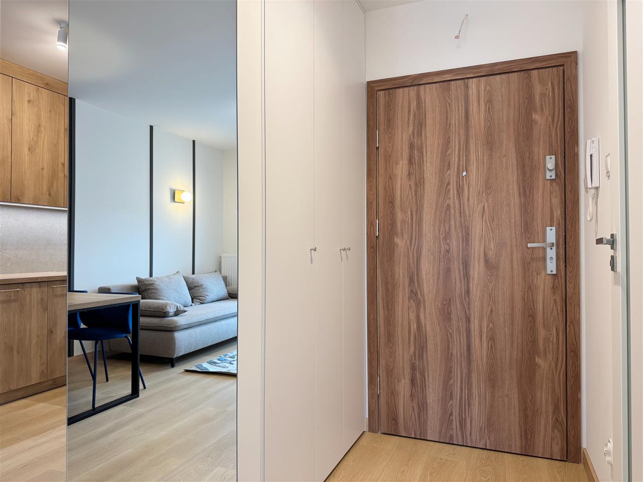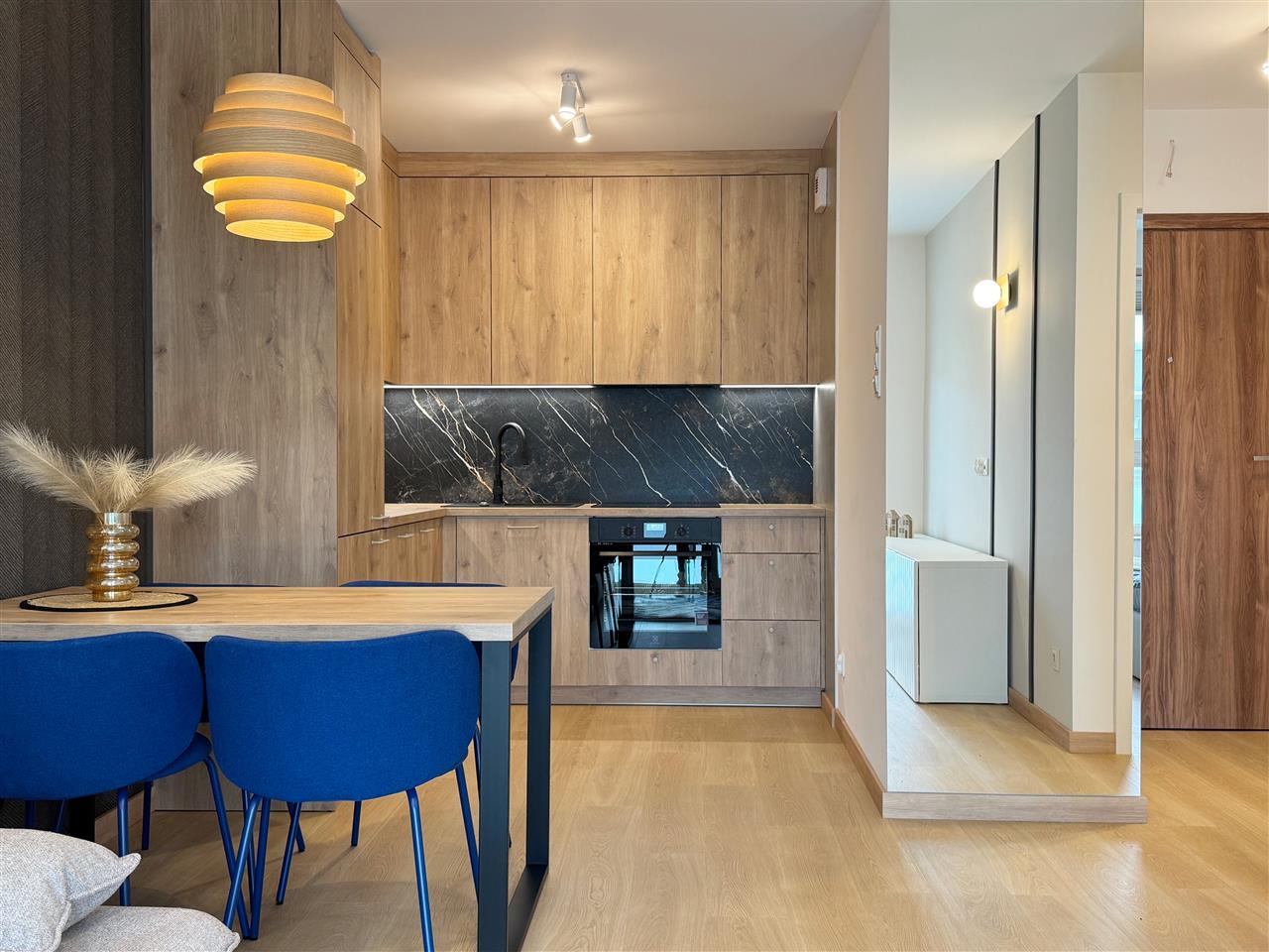 Mieszkanie zostało wykończone z dbałością o najmniejsze detale, przy użyciu wysokiej klasy materiałów. Podłogi wyłożono drewnopodobnymi panelami, a ściany utrzymano w neutralnych kolorach, co nadaje wnętrzu nowoczesny i przyjazny charakter.