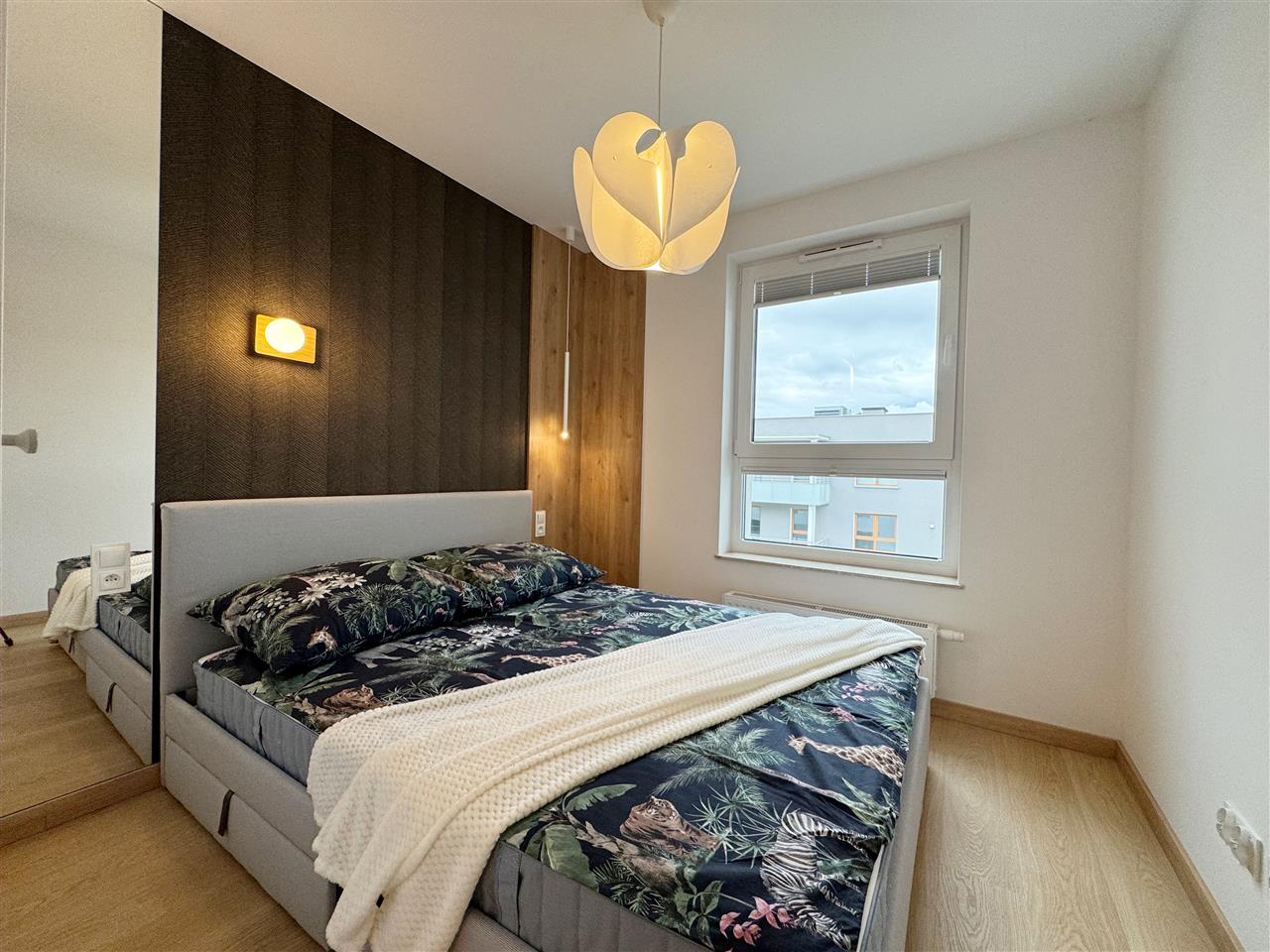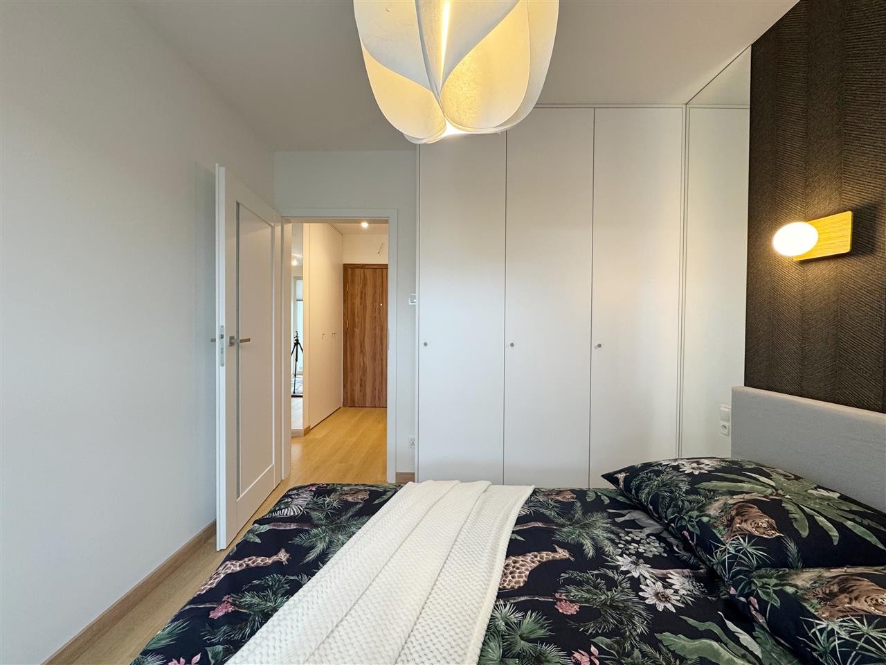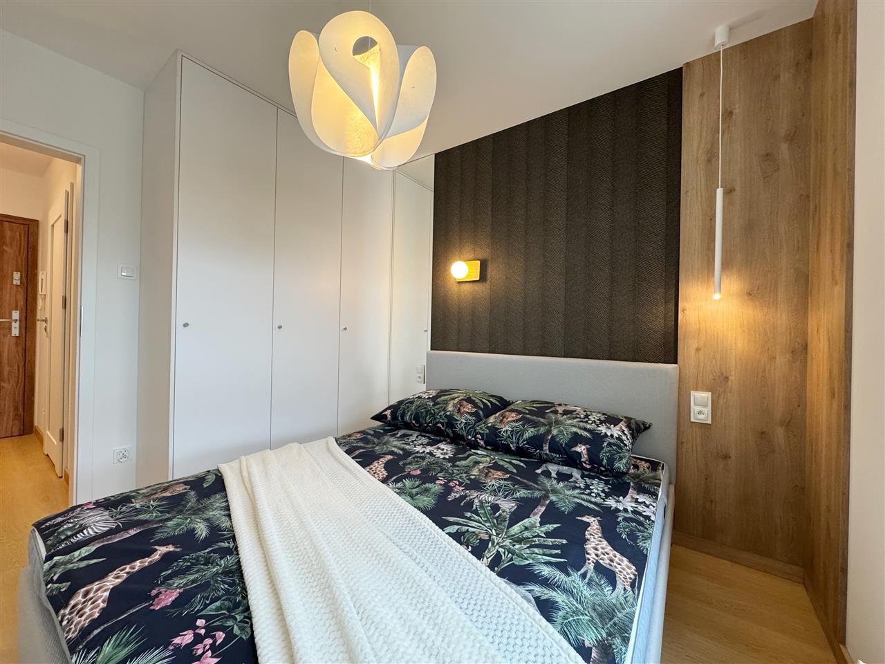 Mieszkanie jest w pełni umeblowane i gotowe do wprowadzenia. W sypialni znajduje się wygodne łóżko, duża szafa garderobiana.