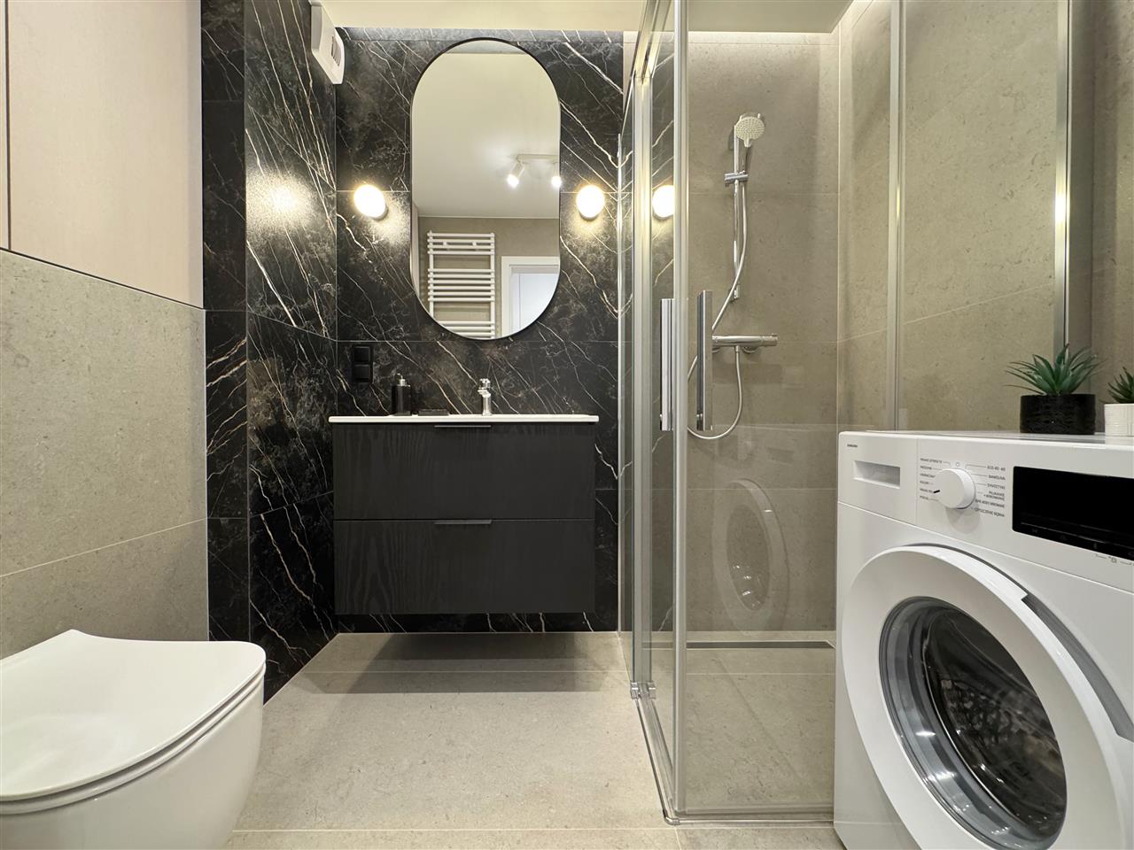 Łazienka wyposażona w nowoczesną armaturę, prysznic i pralkę.