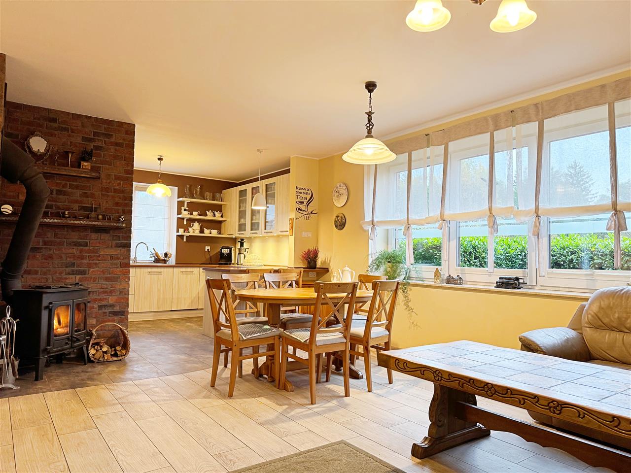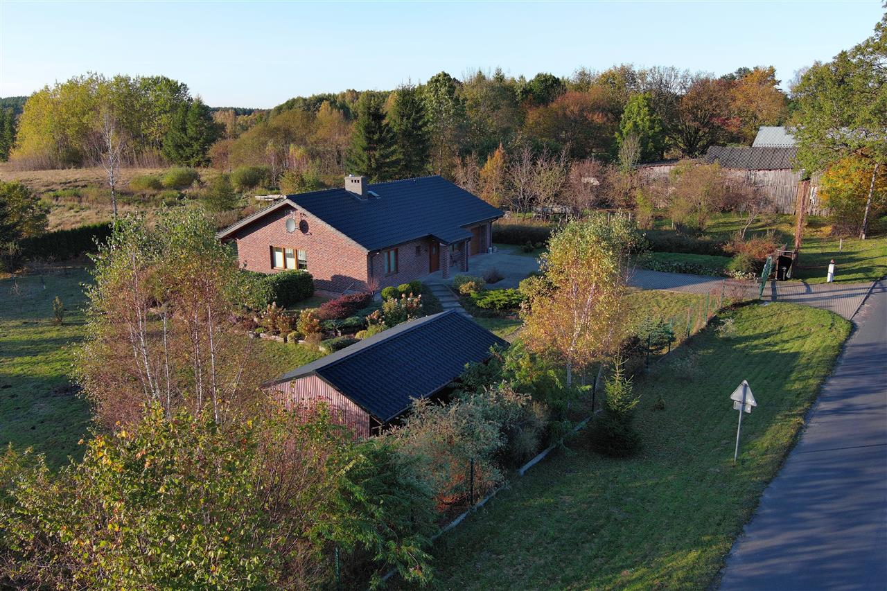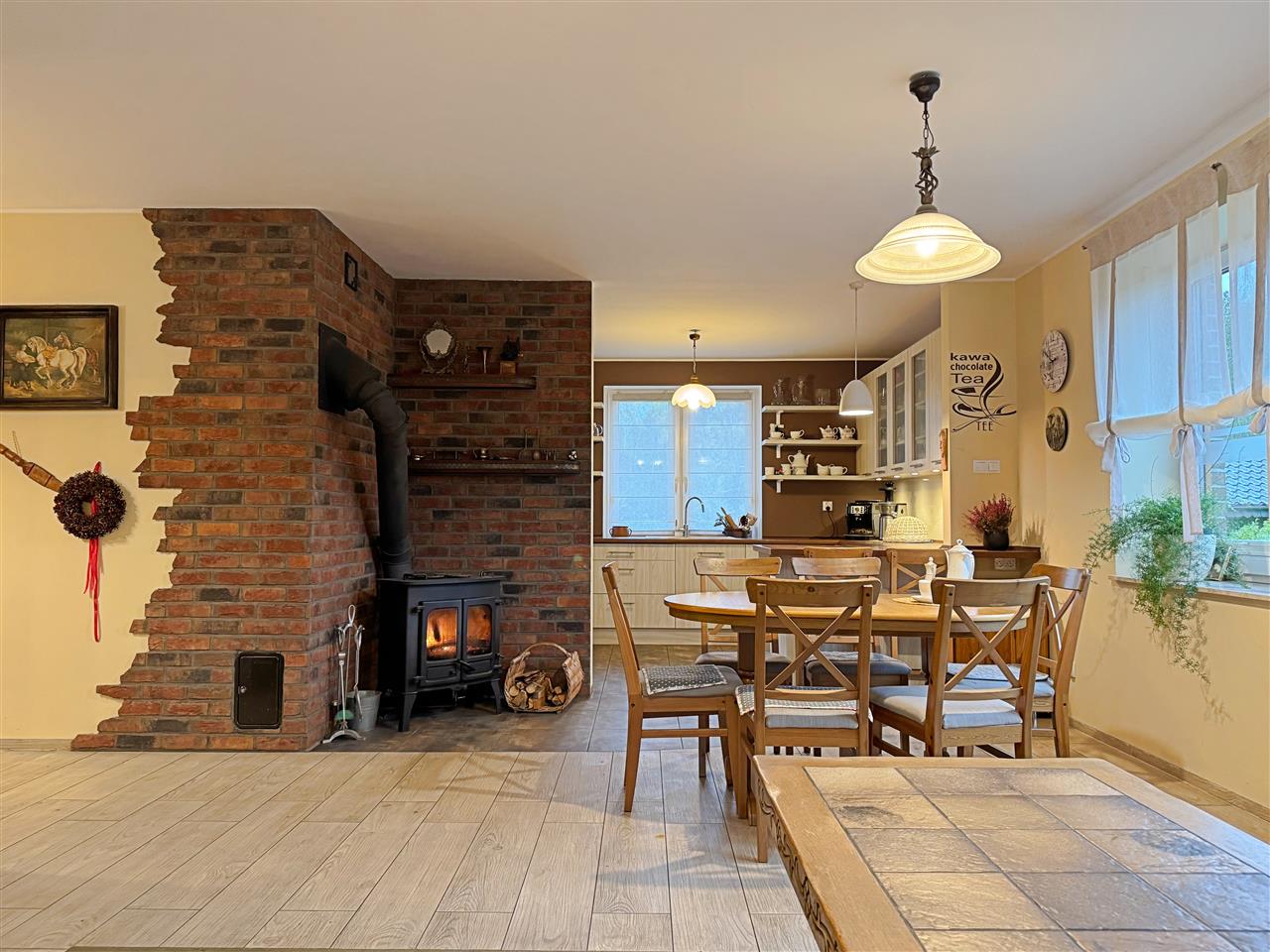 Dane techniczne:Budynek parterowy, niepodpiwniczony, materiał budulcowy: Porotherm, ściany wewnętrzne – pustak ceramiczny. Budynek posadowiony jest na ławie fundamentowej.Grubość ścian 52 cm, (ściana zewnętrzna -12 cm- cegła klinkierowa, pustka- 3 cm, docieplony styropianem 12 cm, Porotherm – 25 cm). Dach dwuspadowy pokryty dachówką ceramiczną.Elewacja: cegła klinkierowa. Ogrzewanie: pompa ciepła głębinowa Buderus z zasobnikiem, ogrzewanie podłogowe, panele fotowoltaiczne, kominek/koza. Okna PCV, dodatkowo moskitiera w salonie oraz żaluzje i rolety okienne.Ściana przy kozie z cegły czerwonej.Media: energia, woda– wodociąg gminny, światłowód.Przydomowa oczyszczalnia ścieków.Zbiornik na wodę z deszczówki z trzema punktami poboru wody na działce.Zewnętrzny punkt poboru wody pitnej.Wiata na samochód z pomieszczeniem gospodarczym oraz wiata na drewno.Dwa niezależne wejścia do budynku.Nieruchomość ogrodzona. Brama wjazdowa oraz garażowa na pilota.Instalacja alarmowa.Nieruchomość posiada liczne nasadzenia i krzewy, wydzielone miejsce na ogródek przydomowy.Podjazdy wyłożone polbrukiem, taras- deska kompozytowa.Bezpośredni dostęp do drogi asfaltowej.