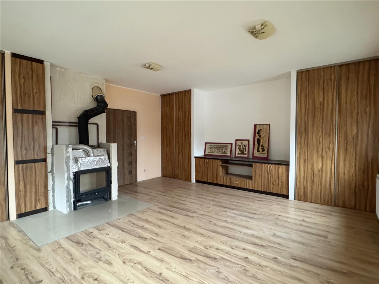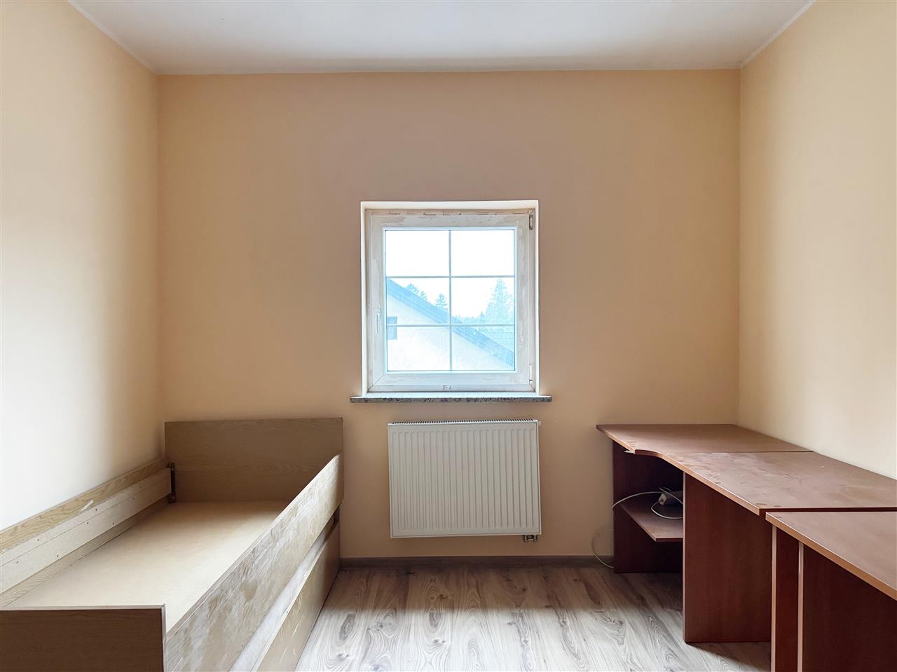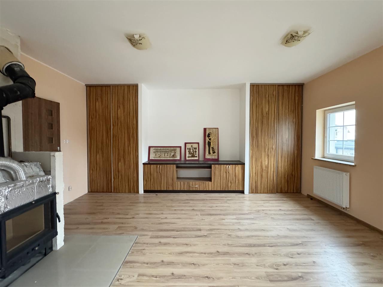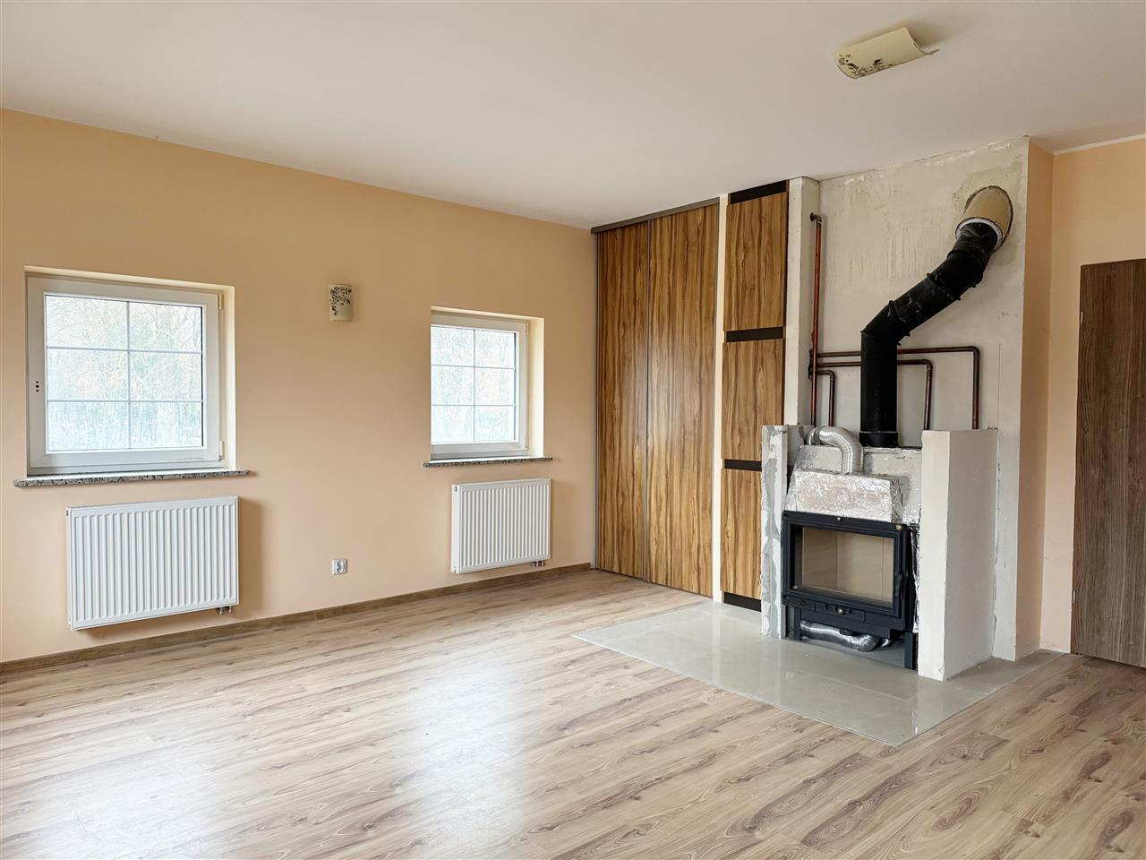 Mieszkanie na piętrze o powierzchni: 84,67 m2.Rozkład pomieszczeń: duży salon z kominkiem (33,12 m2). kuchnia (9,10m2), pokój (14,43 m2), łazianka (8,35 m2), toaleta (2,64 m2), pomieszczenie gospodarcze (3,70 m2), korytarz (9,10m2), klatka schodowa (13,26 m2).Standard wykończenia mieszkania: ściany malowane, na podłodze terakota, łazianka (glazura + terakota), wc (glazura+ terakota), szafy w zabudowie. Kuchnia: meble kuchenne pozostają na wyposażeniu nieruchomości. Kominek posiada płaszcz wodny (do wykończenia).Standard budynku: budynek dwukondygnacyjny, pokryty blachą falistą, elewacja typu putz z ozdobnym kamieniem elewacyjnym (imitacja piaskowca). Klatka schodowa: wykończona. Okna PCV, grzejniki panelowe. Ogrzewanie kominek z płaszczem wodnym, piec na ekogroszek. Budynek posiada trzy niezależne wejścia.