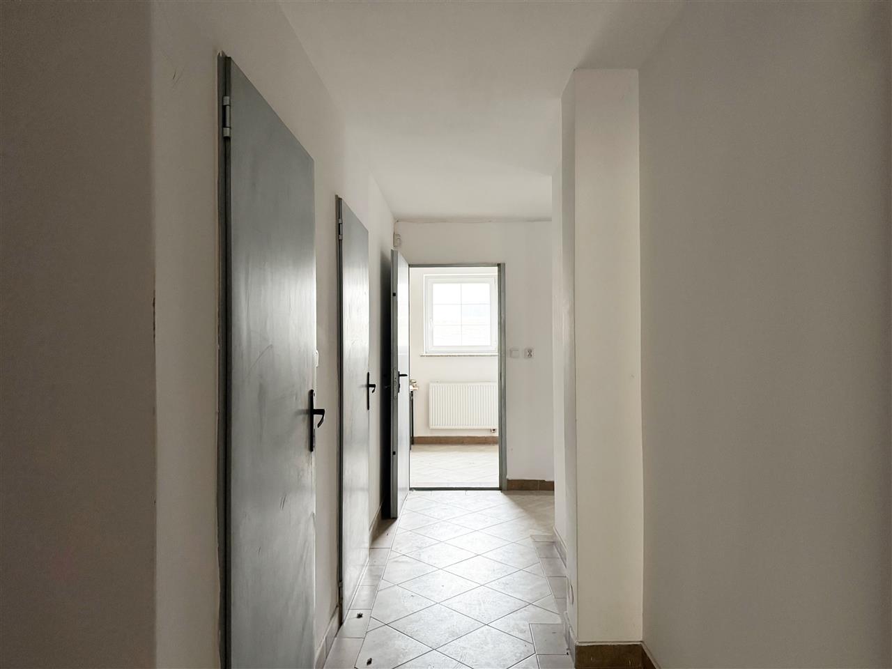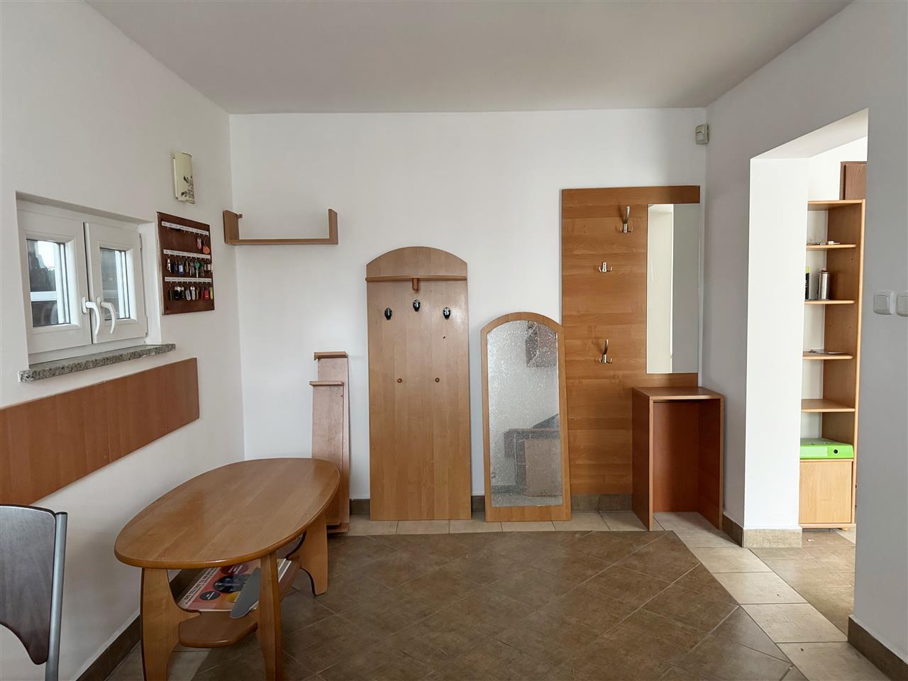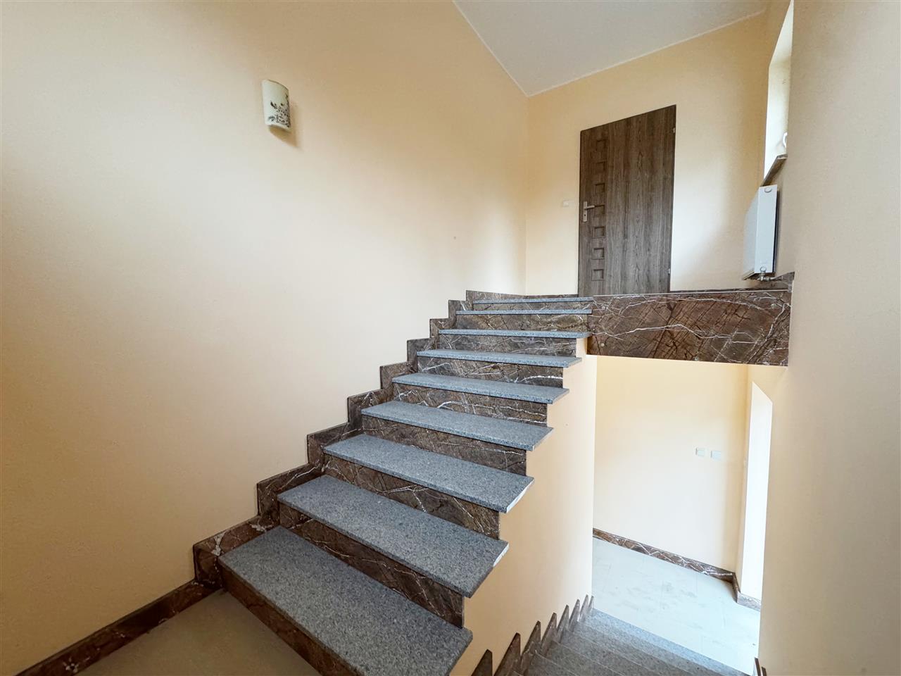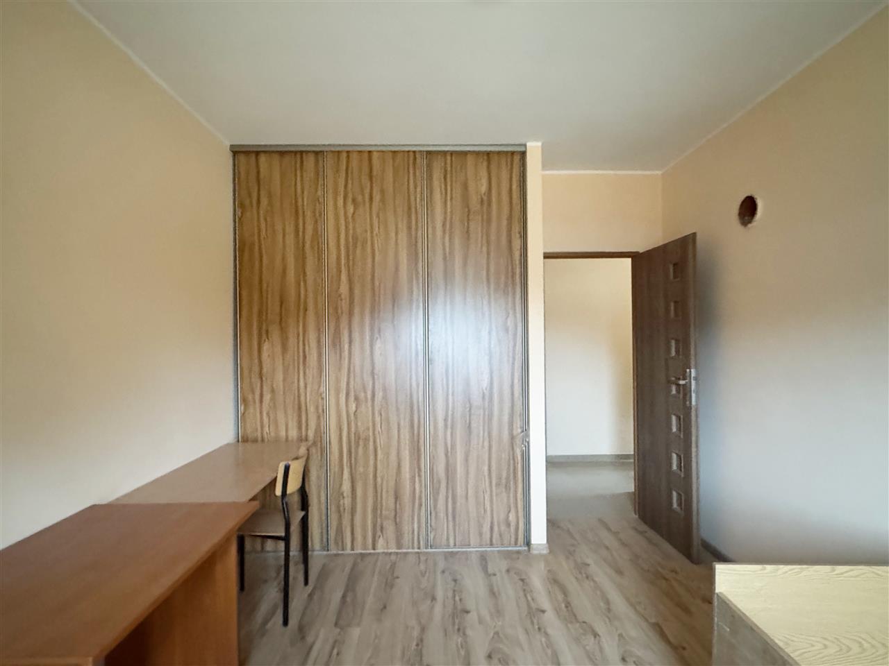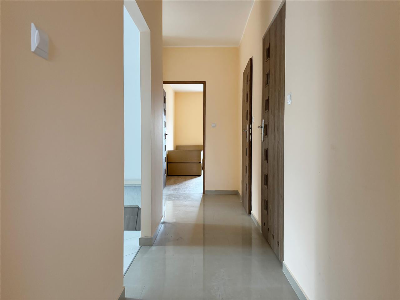 Mieszkanie na piętrze o powierzchni: 84,67 m2.Rozkład pomieszczeń: duży salon z kominkiem (33,12 m2). kuchnia (9,10m2), pokój (14,43 m2), łazianka (8,35 m2), toaleta (2,64 m2), pomieszczenie gospodarcze (3,70 m2), korytarz (9,10m2), klatka schodowa (13,26 m2).Standard wykończenia mieszkania: ściany malowane, na podłodze terakota, łazianka (glazura + terakota), wc (glazura+ terakota), szafy w zabudowie. Kuchnia: meble kuchenne pozostają na wyposażeniu nieruchomości. Kominek posiada płaszcz wodny (do wykończenia).Standard budynku: budynek dwukondygnacyjny, pokryty blachą falistą, elewacja typu putz z ozdobnym kamieniem elewacyjnym (imitacja piaskowca). Klatka schodowa: wykończona. Okna PCV, grzejniki panelowe. Ogrzewanie kominek z płaszczem wodnym, piec na ekogroszek. Budynek posiada trzy niezależne wejścia.