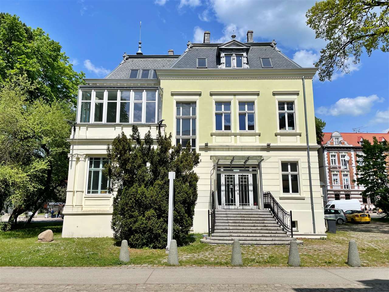 Zabytkowa willa, wybudowana na początku XX wieku, oferuje piękne, przestronne wnętrza z dużymi przeszkleniami oraz zabytkowymi elementami dekoracyjnymi. Znajduje się tu także duża przestrzeń wspólna, która dodaje uroku wnętrzu.