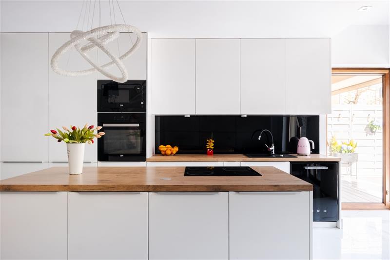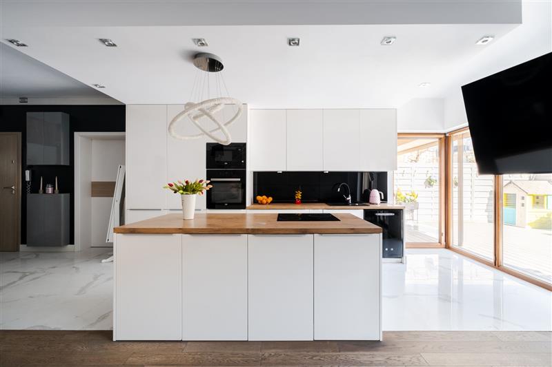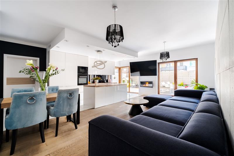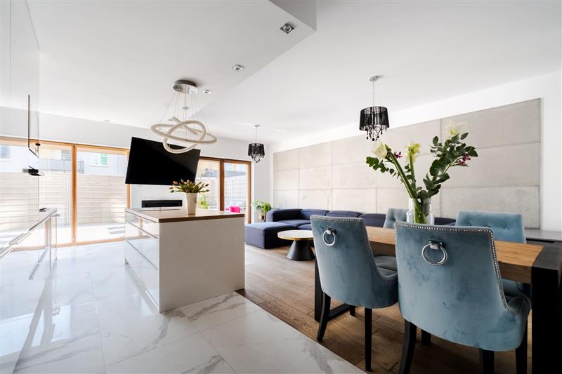 - Salon z aneksem kuchennym oraz wyspą – to przestronne wnętrze pełne światła dziennego.