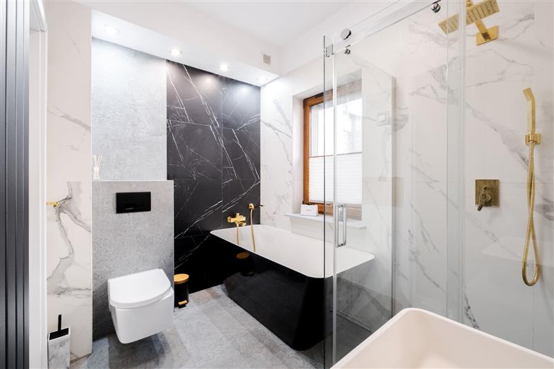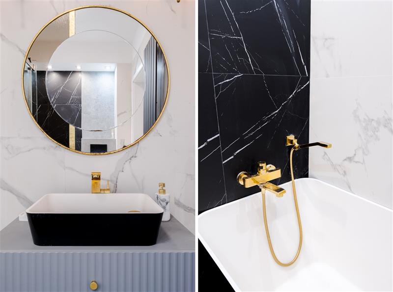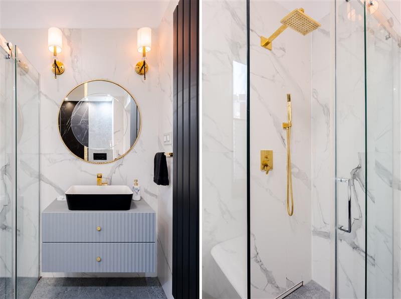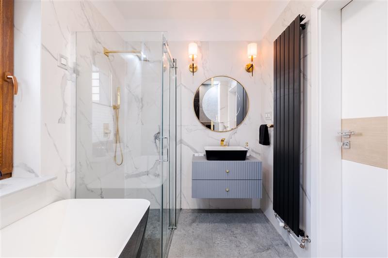 - Łazienka z oknem: wyposażona w kabinę prysznicową, wannę oraz WC,